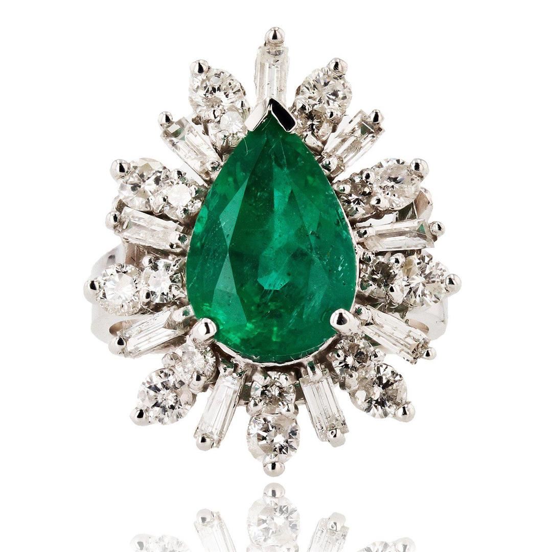 14K Gold Emerald & Diamond Ring One polished, stamped, and tested 14K white gold ring with a bright finish. The ring is mounted with: 1 genuine emerald center stone weighing approximately 3.48 carat, and 27 genuine faceted diamonds weighing approximately 1.67 carats. This item weighs 8.6 grams, condition is new, excellent workmanship. MAIN GEMSTONE Species: Natural Beryl Variety: Emerald Shape: Pear Cutting Style: Brilliant Cut Crown Step Cut Pavilion Measurements: 13.3 x 8.5mm Weight: 3.48 carat Color: Green Cut Grade: Very Good Refractive Index: 1.564 - 1.595 DR Birefringence: 0.005 to 0.009 Hardness: 7.5 - 8 ADJACENT GEMSTONES ON RING Identity: Natural Diamond Cut: Baguette / Round Brilliant Quantity: 27 Diamonds Measurements: 3.5 - 4.5mm (9 baguette) 2.0 - 2.8mm (18 round) Total Weight: 1.67 carats Color Grade: F - H Clarity Grade: SI1 to I1 Refractive Index: 2.418 Hardness: 10 EMERALD WEIGHT: 3.48ct TOTAL DIAMOND WEIGHT: 1.67ctw WEIGHT OF ITEM: 8.6 grams GOLD CONTENT: 14K White Gold