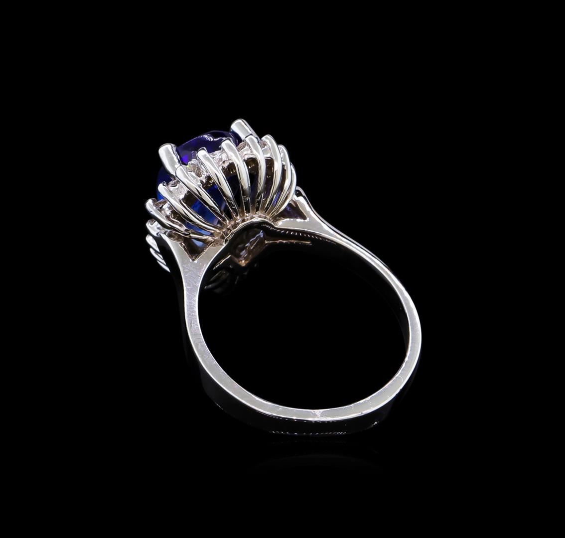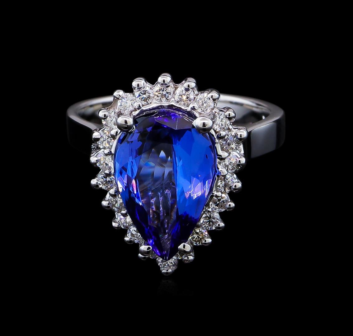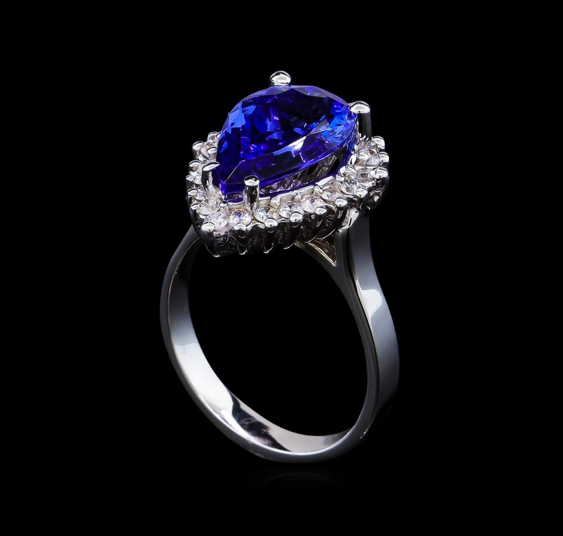 One electronically tested 14KT white gold lady's cast fashion ring with a basket halo with a bright polish finish. The featured lady's ring has a shank measuring 2.85 millimeters in width. Identified with markings of "14K". Condition is new, good workmanship. Containing: One prong set oval pear modified brilliant cut natural tanzanite, measuring 12.83 x 8.28 x 5.00mm, (depth est.) approximate weight of 3.48ct., clarity is eye clean, medium, moderately strong, bluish violet color, (GIA bV 5/4), cut is very good. Transmitting light with no distortion, transparent. Colored gemstones are presumed to have been subjected to commonly used enhancement processes. Graded in the setting. Twenty-Two prong set round brilliant cut diamonds, measuring 1.80 - 1.70 x 1.05mm (depth est.) approximate total weight of 22 Stones = 0.42ct. Graded in the setting. Clarity: VS-2 to SI-2. Color: G - Good. Total Weight of Colored Stones 3.48ct. Total Weight of Diamonds 0.42ct. Total Weight of Ring 6.00gm. GAS Appraised at $7,535.00.