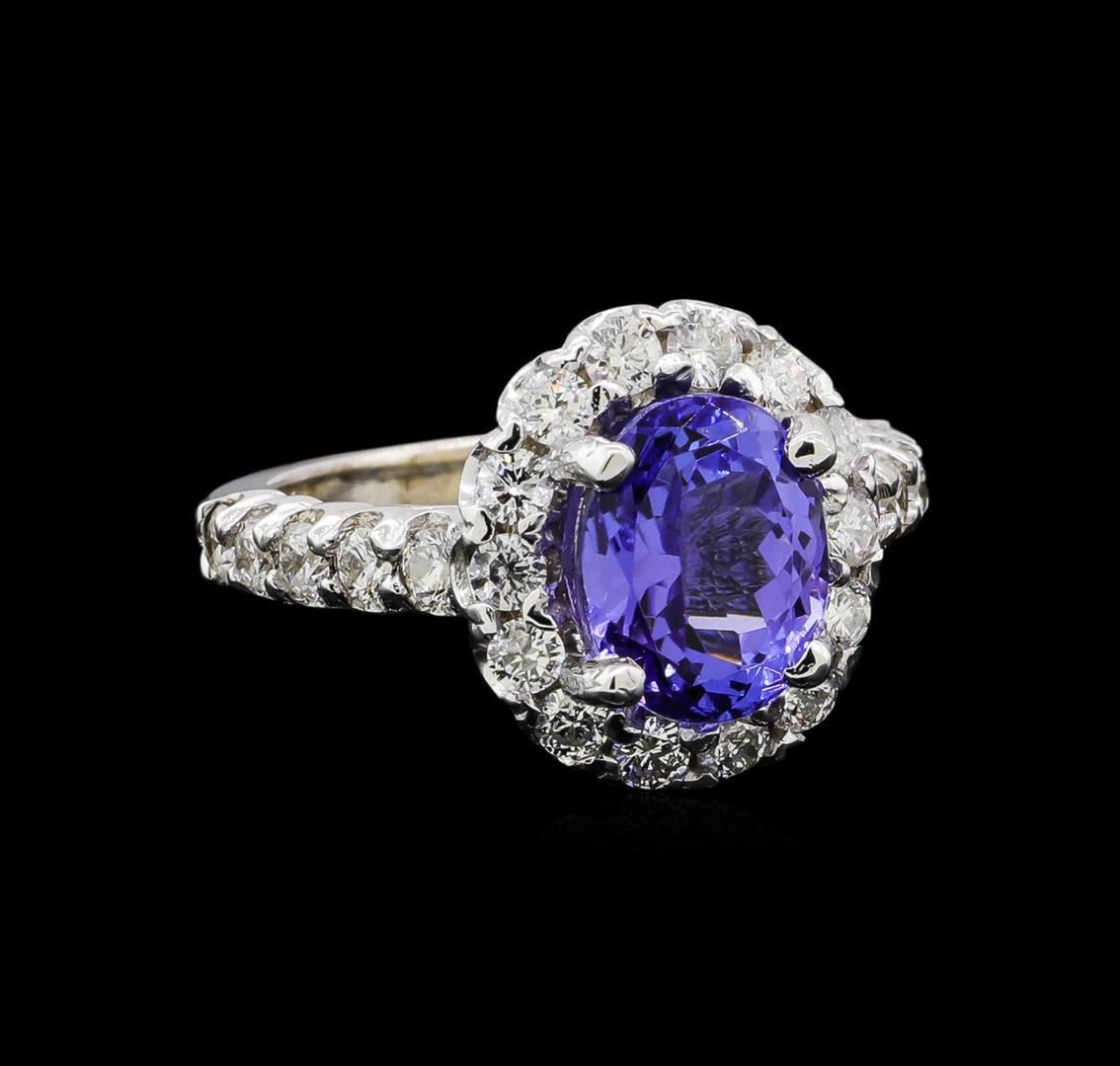 One electronically tested 14KT white gold lady's cast fashion ring with a basket halo with a bright polish finish. The featured lady's ring has a shank measuring 2.32 millimeters in width. Identified with markings of '14K'. Condition is new, good workmanship. Containing: One prong set oval modified brilliant cut natural tanzanite, measuring 9.68 x 7.60 x 5.75mm, (depth est.) 15%. bulge factor, approximate weight of 3.48ct., clarity is eye clean, medium, moderately strong, bluish violet color, (GIA bV 5/4), cut is good. Transmitting light with no distortion, transparent. Colored gemstones are presumed to have been subjected to commonly used enhancement processes. Graded in the setting. Twenty-Four prong set round brilliant cut diamonds, measuring 2.35 - 2.30 x 1.44mm (depth est.) approximate total weight of 24 Stones = 1.15ct. Graded in the setting. Clarity SI-1 to I-1. Color: H - I Cut Good. Total Weight of Colored Stones 3.48ct.. Total Weight of Diamonds 1.15ct.. Total Weight of Ring 6.40gm.