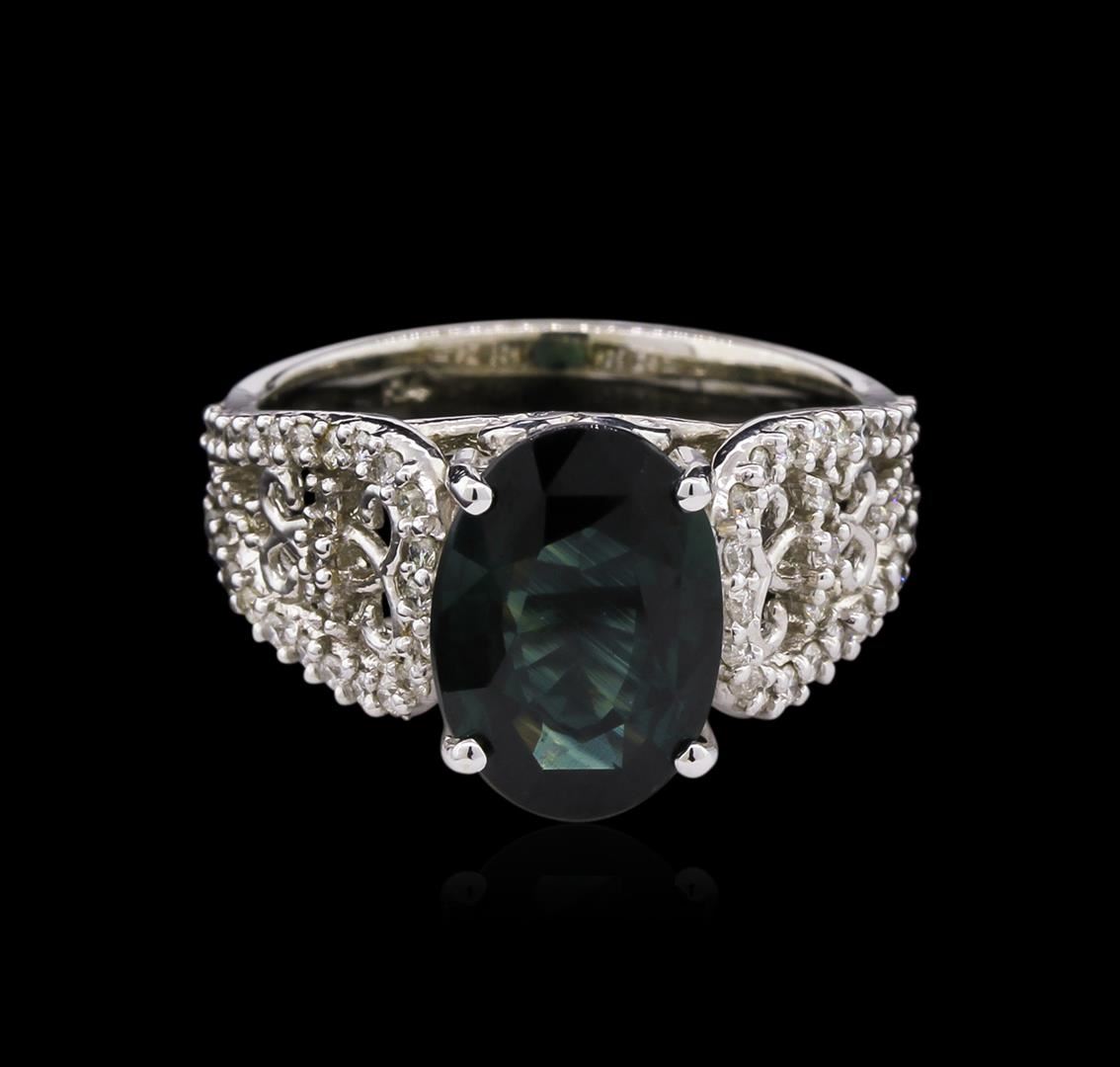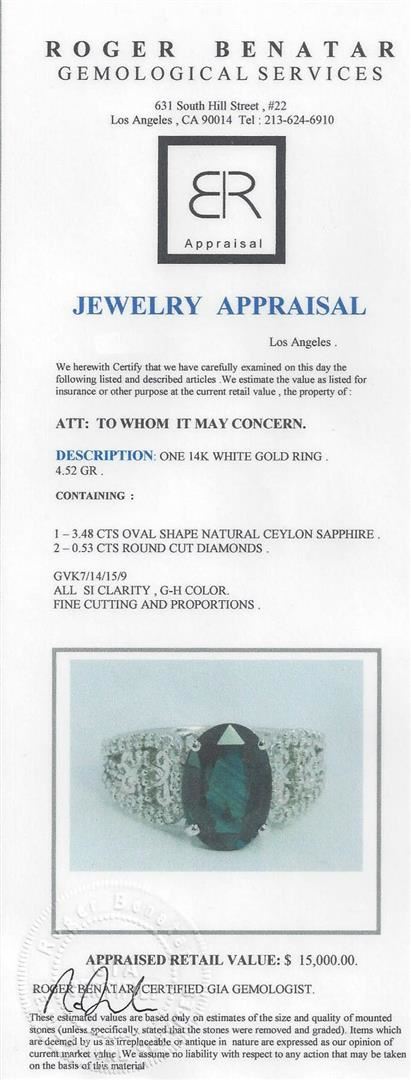One 14KT White Gold ring. 4.52 GR. Containing: 3.48CTS oval shape natural ceylon sapphire. 0.53 CTS round cut diamonds. All SI Clarity, G-H Color Fine Cutting and Proportions. RBGS Appraised at $15,000.00.