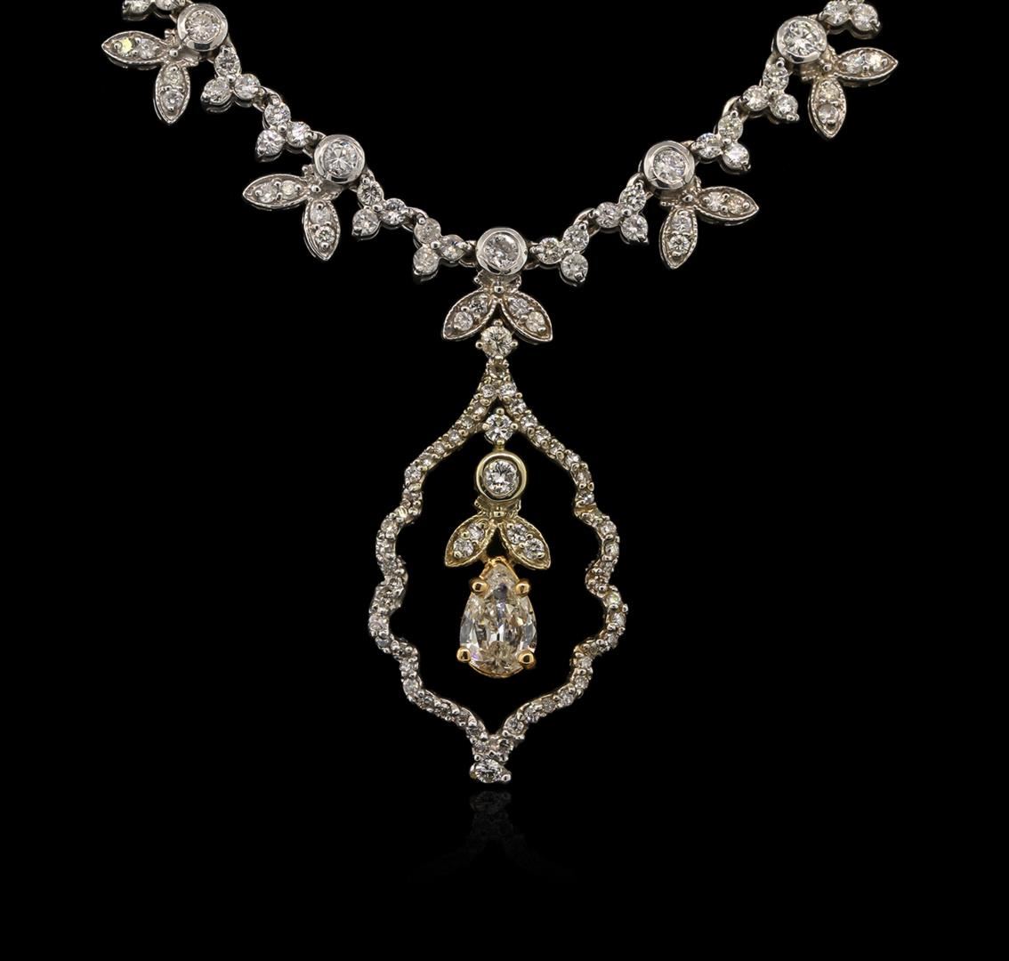 One electronically tested 14KT white and rose gold ladies cast & assembled diamond necklace. Sixteen inch length necklace features an elaborate floral pendant supported by a diamond set floral ribbon transitioning into matching white gold links, terminating in a concealed clasp with safety. Bright polish finish with milgrain detailing. Identified with markings of "14K". Condition is new, good workmanship. Containing: One prong set pear shaped cut diamond, measuring 8.00 x 5.50 x 2.50mm approximate weight of 0.74ct. Graded in the setting. Clarity: SI-1. Color: H Ten prong & bezel set round brilliant cut diamonds, measuring 2.40 - 2.30 x 1.41mm (depth est.) approximate. Total Weight of 10 Stones = 0.57ct. Graded in the setting. Clarity: VS-2 to SI-1. Color: G - I Eighty-One prong set round brilliant cut diamonds, measuring 1.90 - 1.70 x 1.08mm (depth est.) approximate. Total Weight of 81 Stones = 1.82ct. Graded in the setting. Clarity: SI-1 to I-1. Color: G - I Forty-Nine prong set round brilliant cut diamonds, measuring 1.30 - 1.20 x 0.75mm (depth est.) approximate. Total Weight of 49 Stones = 0.35ct. Graded in the setting. Clarity: VS-2 to SI-1. Color: H - J. Total Weight of Diamonds 3.48ct. Total Weight of Necklace 27.07gm. AIG Appraised at $18,530.00.