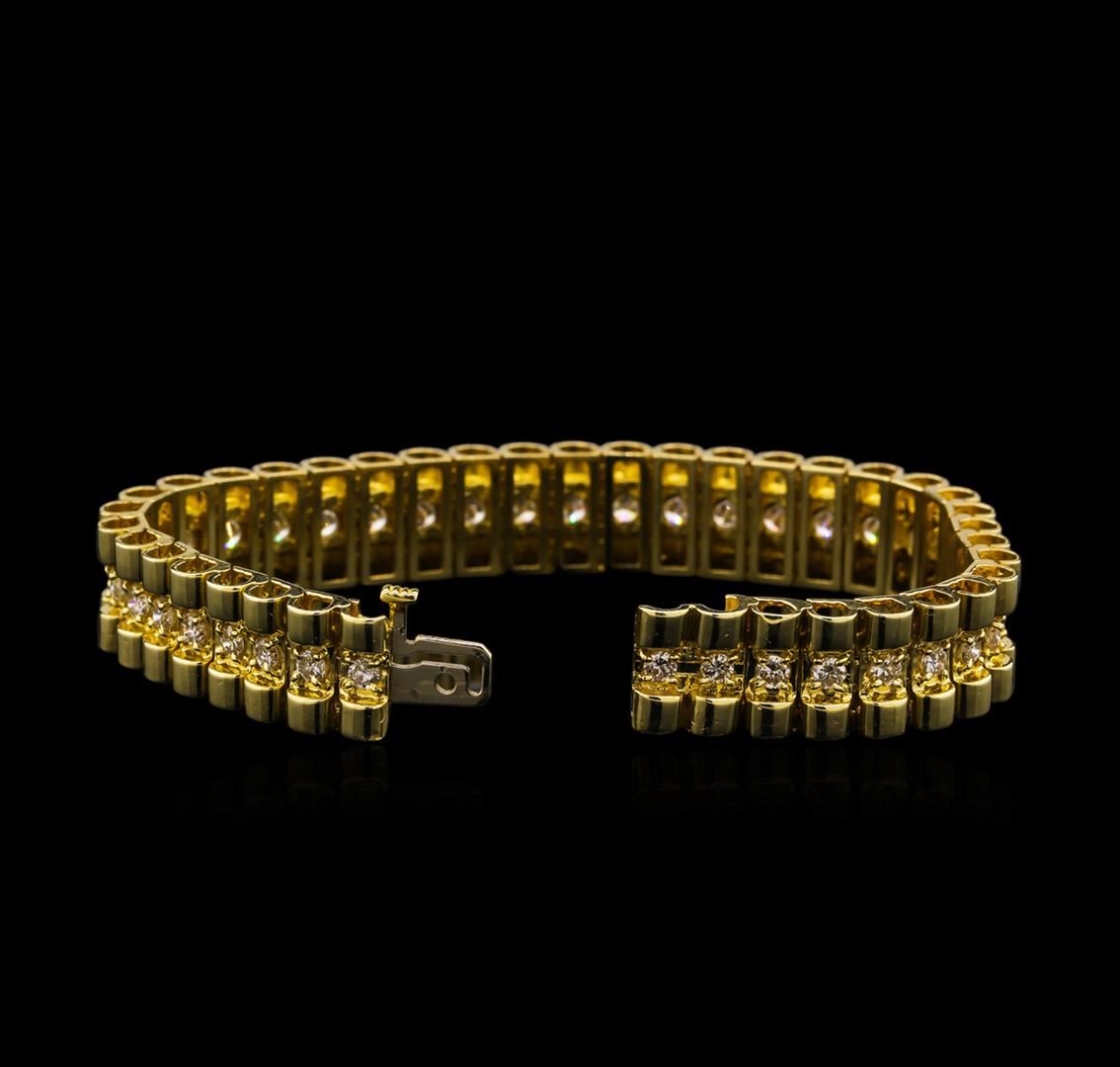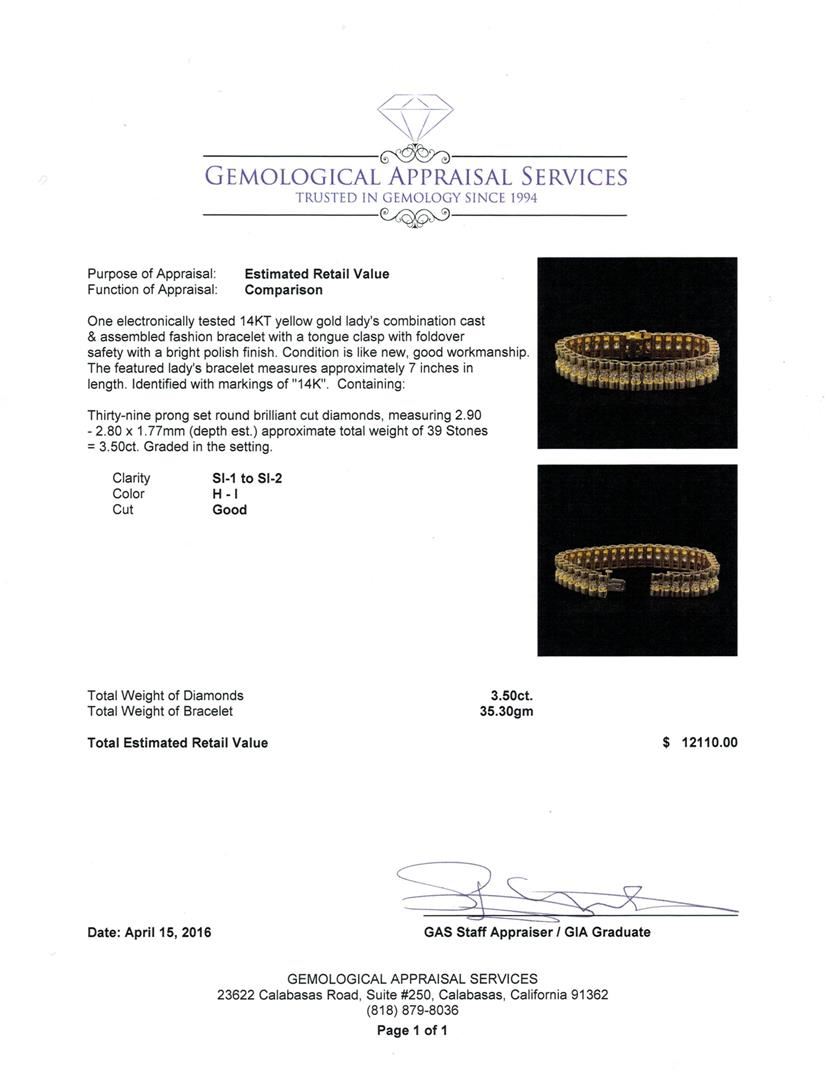 One electronically tested 14KT yellow gold lady's combination cast & assembled fashion bracelet with a tongue clasp with foldover safety with a bright polish finish. The featured lady's bracelet measures approximately 7 inches in length. Identified with markings of "14K". Condition is like new, good workmanship. Containing: Thirty-Nine prong set round brilliant cut diamonds, measuring 2.90 - 2.80 x 1.77mm (depth est.) approximate total weight of 39 Stones = 3.50ct. Graded in the setting. Clarity: SI-1 to SI-2. Color: H - I. Cut Good. Total Weight of Diamonds 3.50ct. Total Weight of Bracelet 35.30gm. GAS Appraised at $12,110.00.