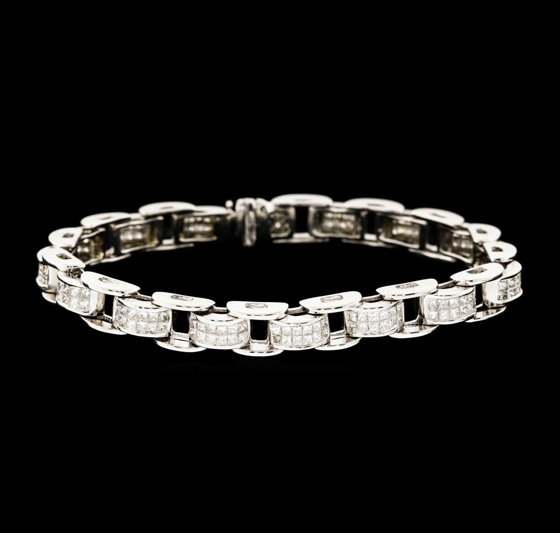 One electronically tested 14KT white gold ladies cast & assembled diamond bracelet. Seven inch length bracelet features a flexible ribbon of diamond set links terminating in a concealed clasp with safety. Bright polish finish. Condition is good. Containing: One Hundred Ninety-Two invisible set princess cut diamonds, measuring 1.60 x 1.40 x 1.05mm (depth est.) approximate total weight of 192 Stones = 3.50ct. Graded in the setting. Clarity VS-1 to VS-2. Color: G - H. Total Weight of Diamonds 3.50ct.. Total Weight of Bracelet 25.01gm. AIG Appraised at $13,885.00.