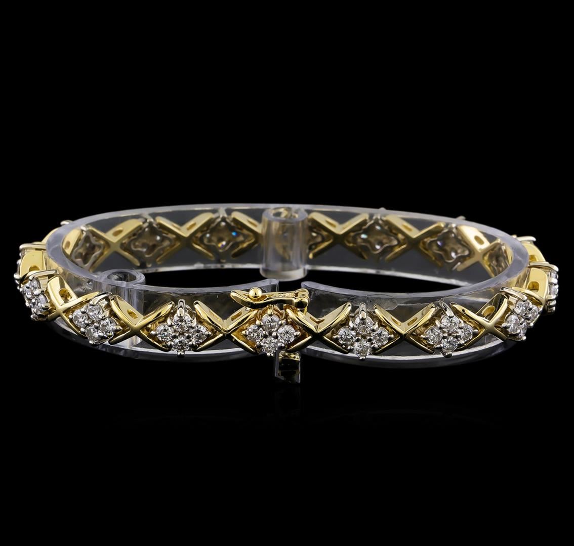 One electronically tested 14KT yellow and white gold lady's combination cast & assembled fashion straight line bracelet with a tongue clasp with foldover safety with a bright polish finish. The featured lady's straight line bracelet measures 7 inches in length. Identified with markings of "14K". Condition is new, good workmanship. Containing: Sixty-Four prong set round brilliant cut diamonds, measuring 2.50 - 2.40 x 1.52mm (depth est.) approximate total weight of 64 Stones = 3.50ct. Graded in the setting. Clarity: SI-1 to SI-2. Color: G - I. Cut Good. Total Weight of Diamonds 3.50ct. Total Weight of Straight Line Bracelet 24.00gm. GAS Appraised at $10,255.00.