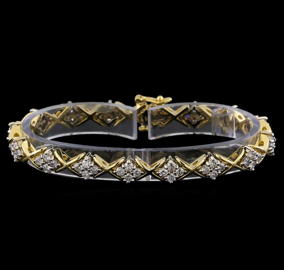One electronically tested 14KT yellow and white gold lady's combination cast & assembled fashion straight line bracelet with a tongue clasp with foldover safety with a bright polish finish. The featured lady's straight line bracelet measures 7 inches in length. Identified with markings of "14K". Condition is new, good workmanship. Containing: Sixty-Four prong set round brilliant cut diamonds, measuring 2.50 - 2.40 x 1.52mm (depth est.) approximate total weight of 64 Stones = 3.50ct. Graded in the setting. Clarity: SI-1 to SI-2. Color: G - I. Cut Good. Total Weight of Diamonds 3.50ct. Total Weight of Straight Line Bracelet 24.00gm. GAS Appraised at $10,255.00.