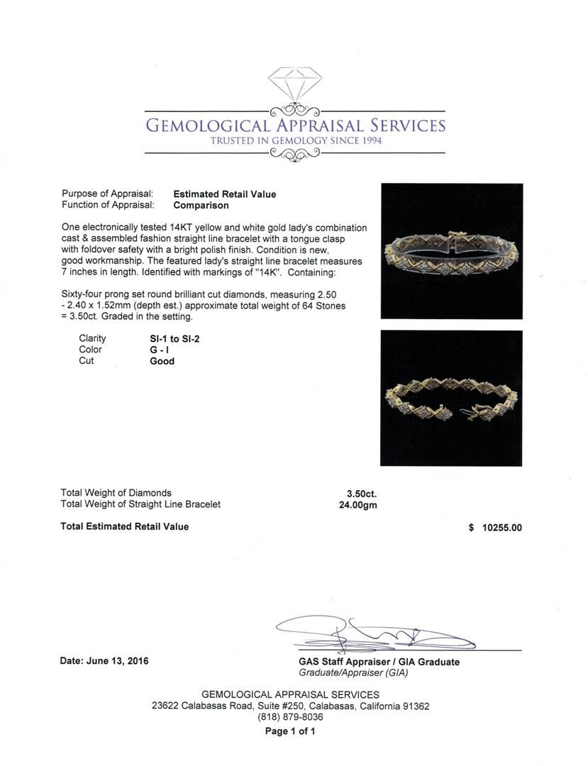 One electronically tested 14KT yellow and white gold lady's combination cast & assembled fashion straight line bracelet with a tongue clasp with foldover safety with a bright polish finish. The featured lady's straight line bracelet measures 7 inches in length. Identified with markings of "14K". Condition is new, good workmanship. Containing: Sixty-Four prong set round brilliant cut diamonds, measuring 2.50 - 2.40 x 1.52mm (depth est.) approximate total weight of 64 Stones = 3.50ct. Graded in the setting. Clarity: SI-1 to SI-2. Color: G - I. Cut Good. Total Weight of Diamonds 3.50ct. Total Weight of Straight Line Bracelet 24.00gm. GAS Appraised at $10,255.00.