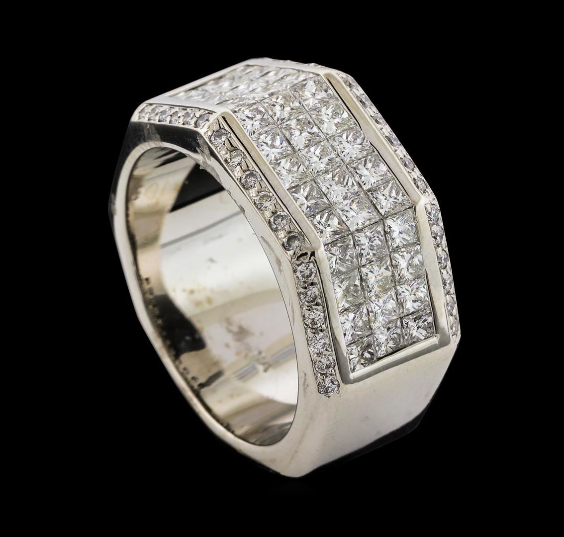 One electronically tested 14KT white gold man's cast wedding ring with a octagonal shank with a bright polish finish. The featured man's ring has a shank measuring 11.35 millimeters wide. Condition is new, good workmanship. Containing: Thirty-Nine invisible set princess cut diamonds, measuring 2.40 x 2.35 x 1.76mm (depth est.) approximate total weight of 39 Stones = 3.17ct. Graded in the setting. Clarity VS-2 to SI-2. Color: H - I Cut Very Good Thirty-Six prong set round brilliant cut diamonds, measuring 1.40 - 1.30 x 0.82mm (depth est.) approximate total weight of 36 Stones = 0.33ct. Graded in the setting. Clarity VS-2 to SI-1. Color: H - I Cut Good. Total Weight of Diamonds 3.50ct.. Total Weight of Ring 27.40gm. GAS Appraised at $11,365.00.