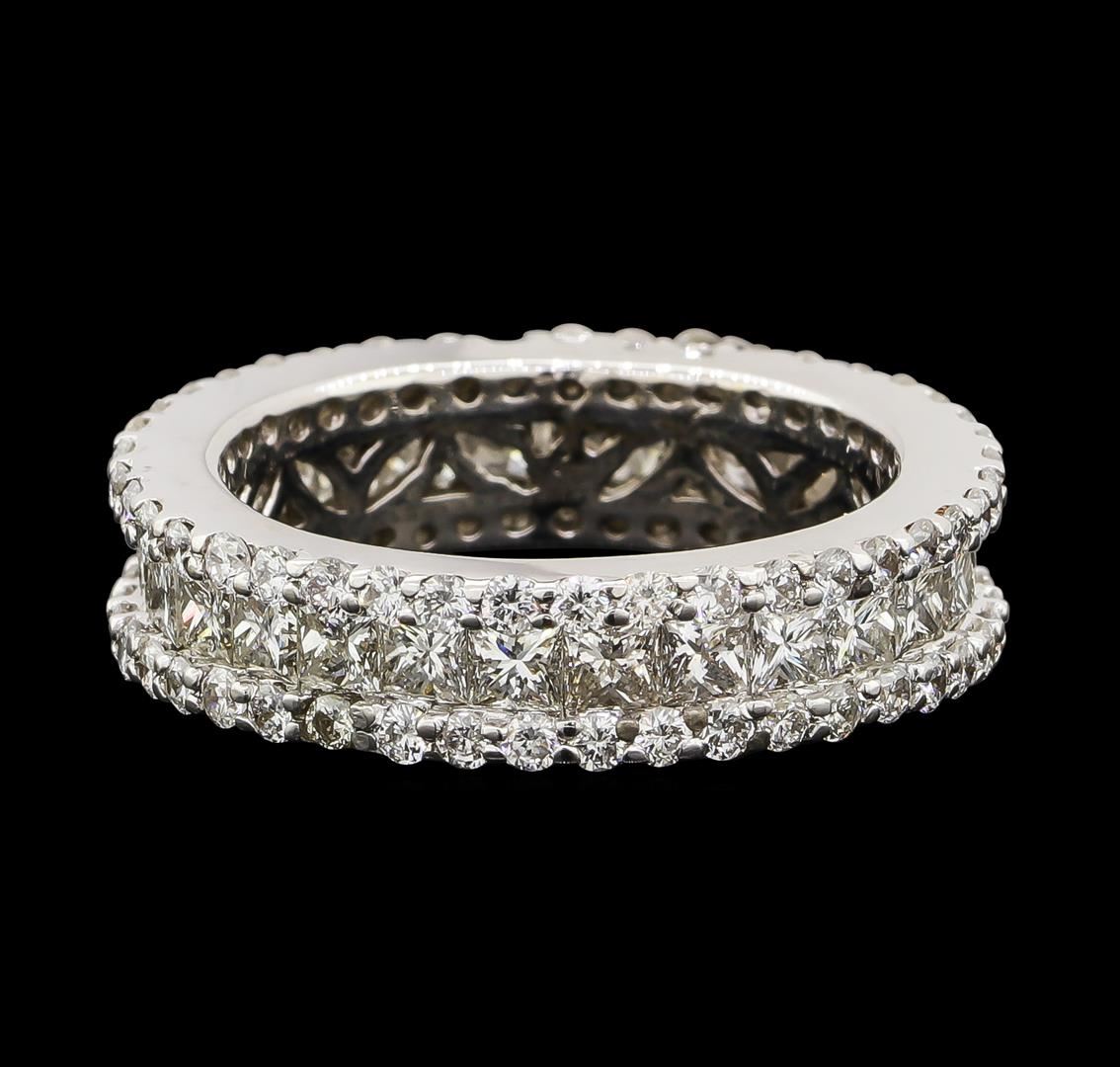 One electronically tested 18KT white gold lady's cast eternity ring with a bright polish finish. The featured lady's ring has a shank measuring 5.15 millimeters wide. Identified with markings of '750'. Condition is like new, good workmanship. Containing: Twenty-Eight channel set princess cut diamonds, measuring 2.50 x 2.40 x 1.80mm (depth est.) approximate total weight of 28 Stones = 2.50ct. Graded in the setting. Clarity VS-2 to SI-1. Color: H - I Cut Very Good Eighty-Two prong set round brilliant cut diamonds, measuring 1.50 - 1.45 x 0.92mm (depth est.) approximate total weight of 82 Stones = 1.00ct. Graded in the setting. Clarity SI-1 to SI-2. Color: H - J Cut Good. Total Weight of Diamonds 3.50ct.. Total Weight of Ring 6.80gm. GAS Appraised at $7,290.00.