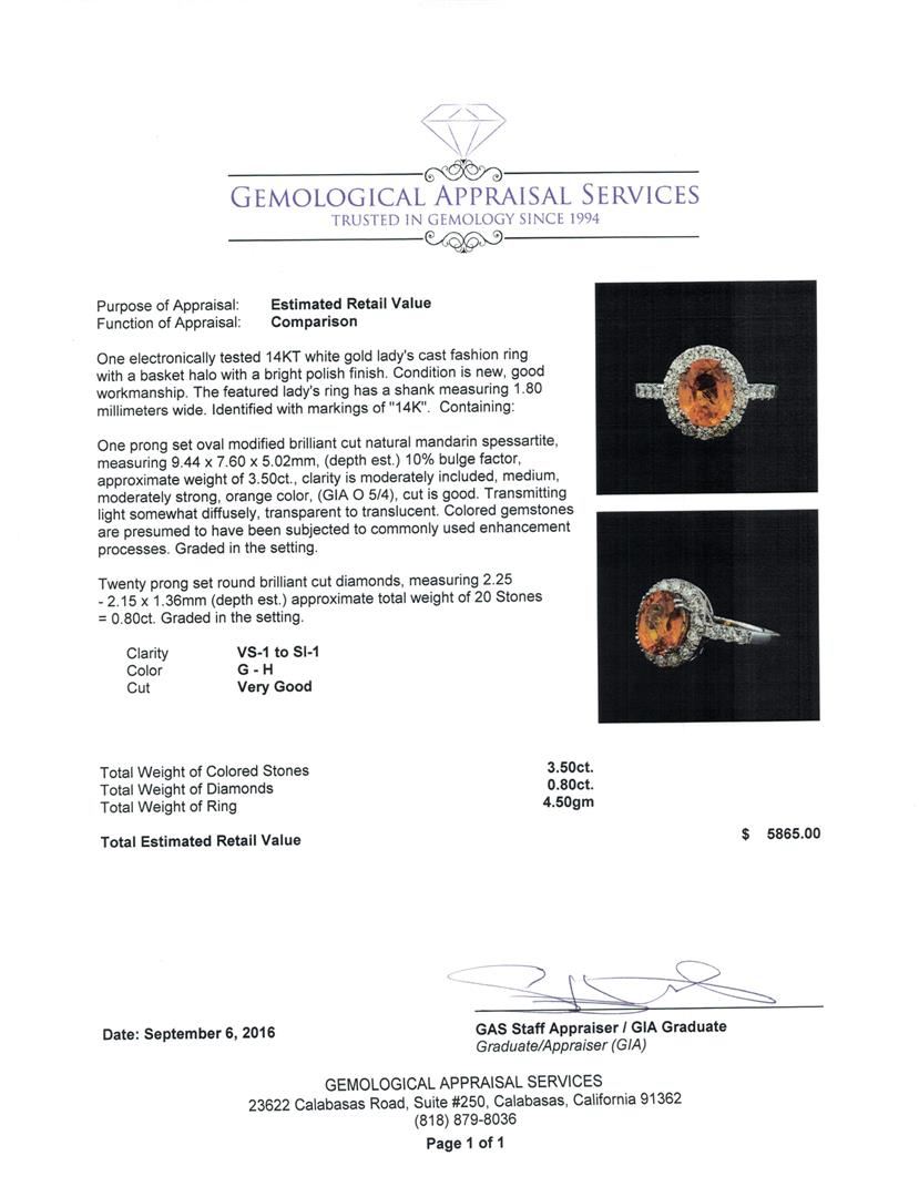 One electronically tested 14KT white gold lady's cast fashion ring with a basket halo with a bright polish finish. The featured lady's ring has a shank measuring 1.80 millimeters wide. Identified with markings of '14K'. Condition is new, good workmanship. Containing: One prong set oval modified brilliant cut natural mandarin spessartite, measuring 9.44 x 7.60 x 5.02mm, (depth est.) 10%. bulge factor, approximate weight of 3.50ct., clarity is moderately included, medium, moderately strong, orange color, (GIA O 5/4), cut is good. Transmitting light somewhat diffusely, transparent to translucent. Colored gemstones are presumed to have been subjected to commonly used enhancement processes. Graded in the setting. Twenty prong set round brilliant cut diamonds, measuring 2.25 - 2.15 x 1.36mm (depth est.) approximate total weight of 20 Stones = 0.80ct. Graded in the setting. Clarity VS-1 to SI-1. Color: G - H Cut Very Good. Total Weight of Colored Stones 3.50ct.. Total Weight of Diamonds 0.80ct.. Total Weight of Ring 4.50gm GAS Appraised at $5,865.00.