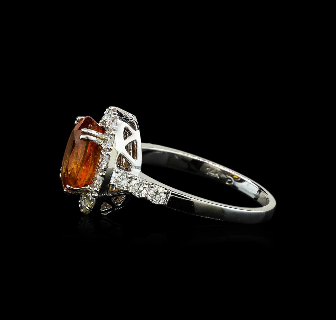 One electronically tested 14KT white gold lady's cast fashion ring with a basket halo with a bright polish finish. The featured lady's ring has a shank measuring 1.80 millimeters wide. Identified with markings of '14K'. Condition is new, good workmanship. Containing: One prong set oval modified brilliant cut natural mandarin spessartite, measuring 9.44 x 7.60 x 5.02mm, (depth est.) 10%. bulge factor, approximate weight of 3.50ct., clarity is moderately included, medium, moderately strong, orange color, (GIA O 5/4), cut is good. Transmitting light somewhat diffusely, transparent to translucent. Colored gemstones are presumed to have been subjected to commonly used enhancement processes. Graded in the setting. Twenty prong set round brilliant cut diamonds, measuring 2.25 - 2.15 x 1.36mm (depth est.) approximate total weight of 20 Stones = 0.80ct. Graded in the setting. Clarity VS-1 to SI-1. Color: G - H Cut Very Good. Total Weight of Colored Stones 3.50ct.. Total Weight of Diamonds 0.80ct.. Total Weight of Ring 4.50gm GAS Appraised at $5,865.00.