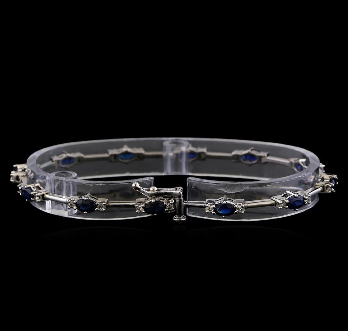 One 14K white gold bracelet 7 inches. 9.29 GR. Containing: Main gemstones: Identity: Blue sapphire. Carat weight: 3.50 CTS TW. 12 PCS. Shape and measurement: Marquis shape. Quality: Good color. Adjacent gemstones: Identity: Natural diamond. Shape: Round cut diamonds. 24 PCS. Carat weight: ),60 CTS TW. Quality: VS-SI clarity, g-h color. All fine cutting and proportions. total gemstones weight: 1.32 CTS TW. RBGS Appraised at $3,000.00.