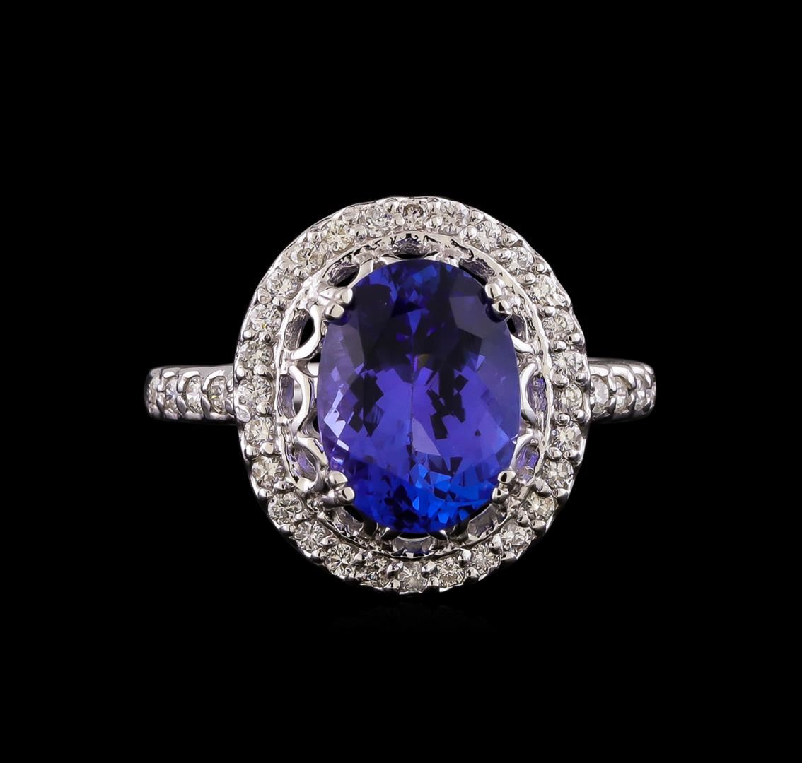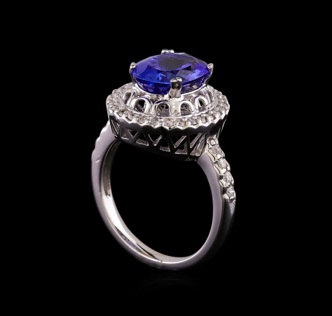 One electronically tested 14KT white gold lady's cast fashion ring with a halo with a bright polish finish. The featured lady's ring has a shank measuring 2.20 millimeters wide. Identified with markings of "14K". Condition is new, good workmanship. Containing: One prong set oval modified brilliant cut natural tanzanite, measuring 11.17 x 8.30 x 5.57mm, (depth est.) approximate weight of 3.50ct., clarity is eye clean, medium dark, moderately strong, violetish blue color, (GIA vB 6/4), cut is very good. Transmitting light with no distortion, transparent. Colored gemstones are presumed to have been subjected to commonly used enhancement processes. Graded in the setting. Eight prong set round brilliant cut diamonds, measuring 1.60 - 1.55 x 0.98mm (depth est.) approximate total weight of 8 Stones = 0.12ct. Graded in the setting. Clarity: SI-1 to SI-2. Color: H - I. Cut Good Twenty-Eight prong set round brilliant cut diamonds, measuring 1.40 - 1.35 x 0.86mm (depth est.) approximate total weight of 28 Stones = 0.28ct. Graded in the setting. Clarity: SI-1 to SI-2. Color: H - I. Cut Good. Total Weight of Colored Stones 3.50ct. Total Weight of Diamonds 0.40ct. Total Weight of Ring 5.60gm. GAS Appraised at $7,845.00.
