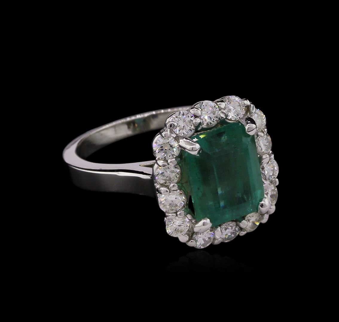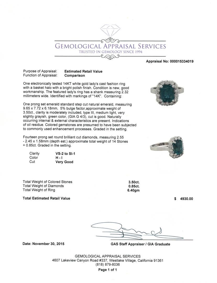 One electronically tested 14KT white gold lady's cast fashion ring with a basket halo with a bright polish finish. The featured lady's ring has a shank measuring 2.32 millimeters wide. Identified with markings of "14K". Condition is new, good workmanship. Containing: One prong set emerald standard step cut natural emerald, measuring 9.65 x 7.72 x 6.18mm, 5%. bulge factor, approximate weight of 3.50ct., clarity is moderately included, type III, medium light, very slightly grayish, green color, (GIA G 4/3), cut is good. Naturally occurring internal & external characteristics are present. Indications of oil residue. Colored gemstones are presumed to have been subjected to commonly used enhancement processes. Graded in the setting. Fourteen prong set round brilliant cut diamonds, measuring 2.55 - 2.45 x 1.58mm (depth est.) approximate total weight of 14 Stones = 0.85ct. Graded in the setting. Clarity: VS-2 to SI-1 . Color: H - I. Cut Very Good. Total Weight of Colored Stones 3.50ct.. Total Weight of Diamonds 0.85ct.. Total Weight of Ring 6.40gm at $ 4930.00 GAS Appraised.