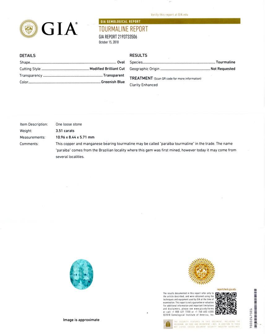 One electronically tested 18KT white gold ladies cast & assembled Paraiba tourmaline and diamond ring. Condition is new, good workmanship. The ring features a Paraiba tourmaline set within a diamond bezel, supported by diamond set split shoulders, completed by four and one half millimeter wide band. Bright polish finish. Trademark is HANA. Identified with markings of "18K". One prong set oval modified brilliant cut natural tourmaline, measuring 10.96 x 8.44 x 5.71mm, exact weight 3.51ct., clarity is moderately included, medium light, moderately strong, greenish blue color, (GIA gB 4/4), cut is good. Transmitting light with a minimum of distortion, transparent. Naturally occurring internal & external characteristics are present. GIA Gemological Report attached. Graded loose prior to setting in the GIA Laboratory, Report #2193733506. This copper and manganese bearing tourmaline may be called "Paraiba tourmaline" in the trade. The name "Paraiba" comes from the Brazilian locality where this gem was first mined, however today it may come from several localities. Fifty prong set round brilliant cut diamonds approximate total weight of 50 Stones = 0.62ct. The clarity & color grade reflect the overall average for the group. Graded in the setting. Clarity: SI-2 to I-2 Color: F - H Total Weight of Colored Stones: 3.51ct. Total Weight of Diamonds: 0.62ct. Total Weight of Ring: 6.90 gm