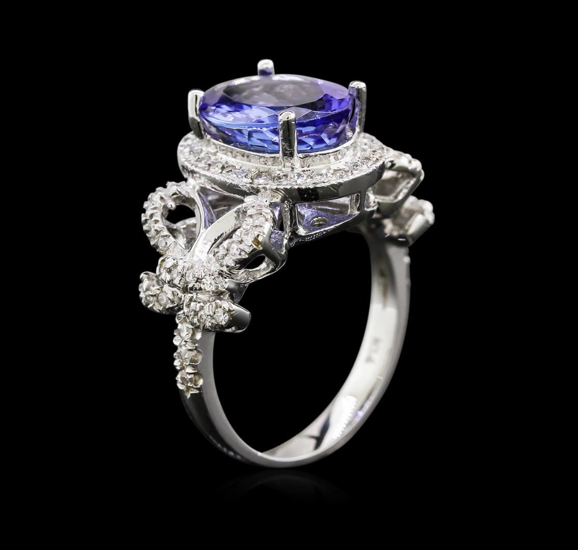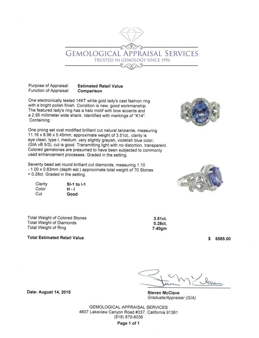 One electronically tested 14KT white gold lady's cast fashion ring with a bright polish finish. The featured lady's ring has a halo motif with bow accents and a 2.95 millimeter wide shank. Identified with markings of "K14". Condition is new, good workmanship. Containing: One prong set oval modified brilliant cut natural tanzanite, measuring 11.16 x 8.96 x 5.45mm, approximate weight of 3.51ct., clarity is eye clean, type I, medium, very slightly grayish, violetish blue color, (GIA vB 5/3), cut is good. Transmitting light with no distortion, transparent. Colored gemstones are presumed to have been subjected to commonly used enhancement processes. Graded in the setting. Seventy bead set round brilliant cut diamonds, measuring 1.10 - 1.00 x 0.63mm (depth est.) approximate total weight of 70 Stones = 0.28ct. Graded in the setting. Clarity: SI-1 to I-1. Color: H - I. Cut Good. Total Weight of Colored Stones 3.51ct. Total Weight of Diamonds 0.28ct. Total Weight of Ring 7.40gm. GAS Appraised at $6,585.00.