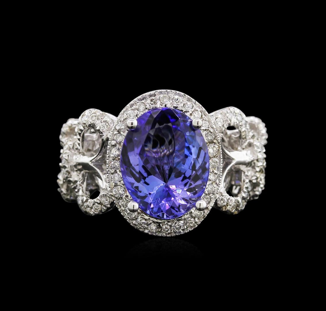 One electronically tested 14KT white gold lady's cast fashion ring with a bright polish finish. The featured lady's ring has a halo motif with bow accents and a 2.95 millimeter wide shank. Identified with markings of "K14". Condition is new, good workmanship. Containing: One prong set oval modified brilliant cut natural tanzanite, measuring 11.16 x 8.96 x 5.45mm, approximate weight of 3.51ct., clarity is eye clean, type I, medium, very slightly grayish, violetish blue color, (GIA vB 5/3), cut is good. Transmitting light with no distortion, transparent. Colored gemstones are presumed to have been subjected to commonly used enhancement processes. Graded in the setting. Seventy bead set round brilliant cut diamonds, measuring 1.10 - 1.00 x 0.63mm (depth est.) approximate total weight of 70 Stones = 0.28ct. Graded in the setting. Clarity: SI-1 to I-1. Color: H - I. Cut Good. Total Weight of Colored Stones 3.51ct. Total Weight of Diamonds 0.28ct. Total Weight of Ring 7.40gm. GAS Appraised at $6,585.00.