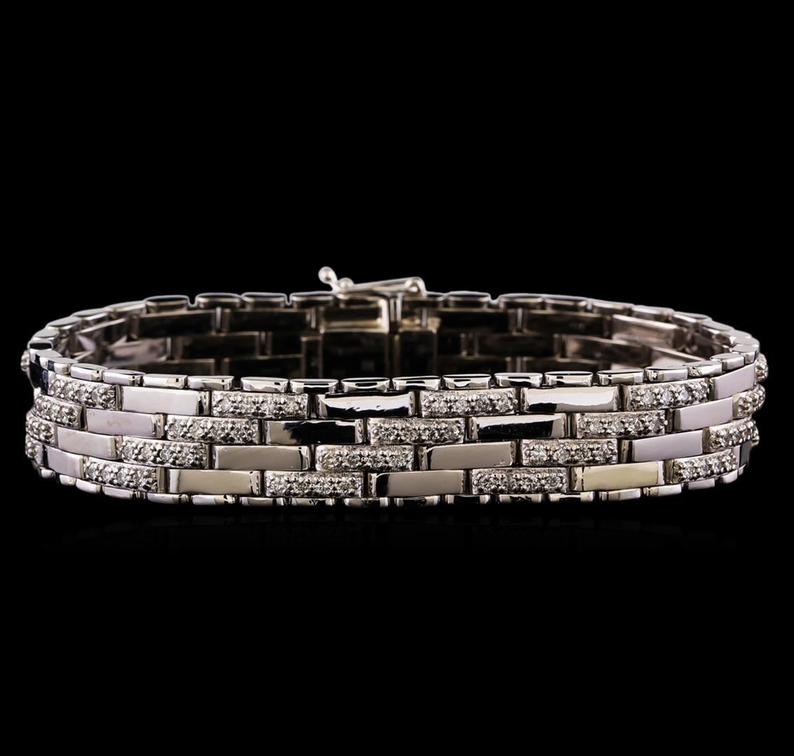 One electronically tested 14KT white gold man's combination cast & assembled fashion bracelet with a tongue clasp with foldover safety with a bright polish finish. The featured man's bracelet has a linked motif and measures 8 inches in length. Identified with markings of '14K'. Condition is new, good workmanship. Containing: One Hundred Fifty-Two prong set round brilliant cut diamonds, measuring 1.90 - 1.80 x 1.11mm (depth est.) approximate total weight of 152 Stones = 3.52ct. Graded in the setting. Clarity SI-1 to SI-2. Color: G - I Cut Good. Total Weight of Diamonds 3.52ct.. Total Weight of Bracelet 66.70gm. GAS Appraised at $17,380.00.