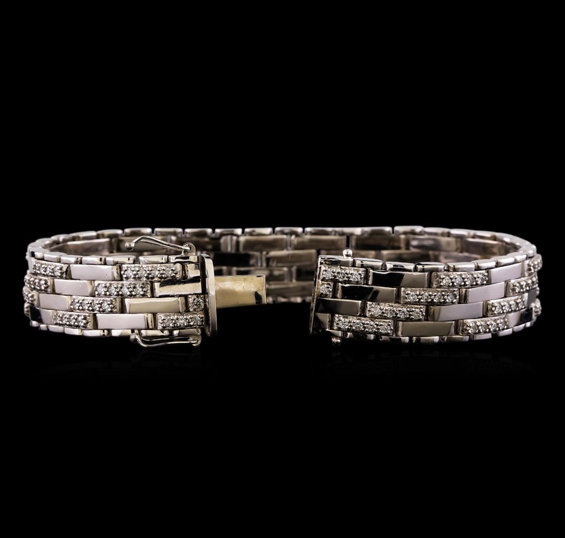 One electronically tested 14KT white gold man's combination cast & assembled fashion bracelet with a tongue clasp with foldover safety with a bright polish finish. The featured man's bracelet has a linked motif and measures 8 inches in length. Identified with markings of '14K'. Condition is new, good workmanship. Containing: One Hundred Fifty-Two prong set round brilliant cut diamonds, measuring 1.90 - 1.80 x 1.11mm (depth est.) approximate total weight of 152 Stones = 3.52ct. Graded in the setting. Clarity SI-1 to SI-2. Color: G - I Cut Good. Total Weight of Diamonds 3.52ct.. Total Weight of Bracelet 66.70gm. GAS Appraised at $17,380.00.