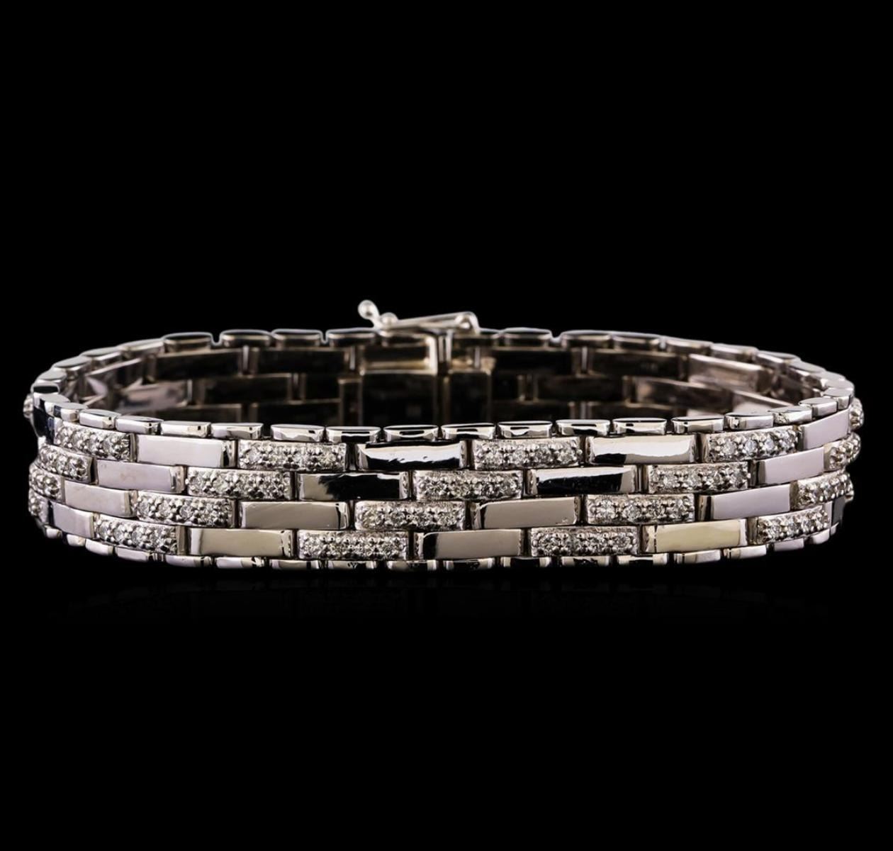 One electronically tested 14KT white gold man's combination cast & assembled fashion bracelet with a tongue clasp with foldover safety with a bright polish finish. The featured man's bracelet has a linked motif and measures 8 inches in length. Identified with markings of '14K'. Condition is new, good workmanship. Containing: One Hundred Fifty-Two prong set round brilliant cut diamonds, measuring 1.90 - 1.80 x 1.11mm (depth est.) approximate total weight of 152 Stones = 3.52ct. Graded in the setting. Clarity SI-1 to SI-2. Color: G - I Cut Good. Total Weight of Diamonds 3.52ct.. Total Weight of Bracelet 66.70gm. GAS Appraised.