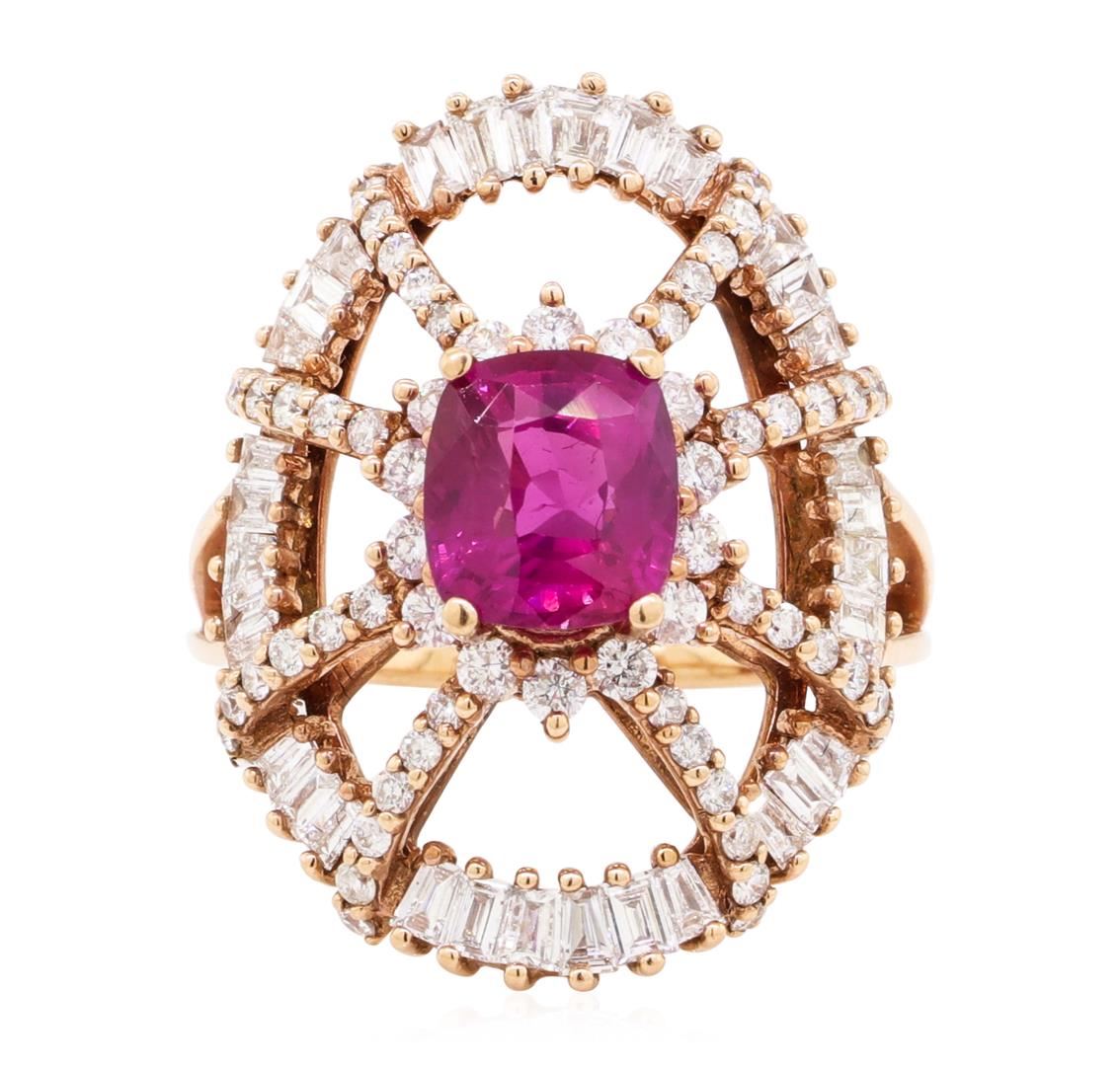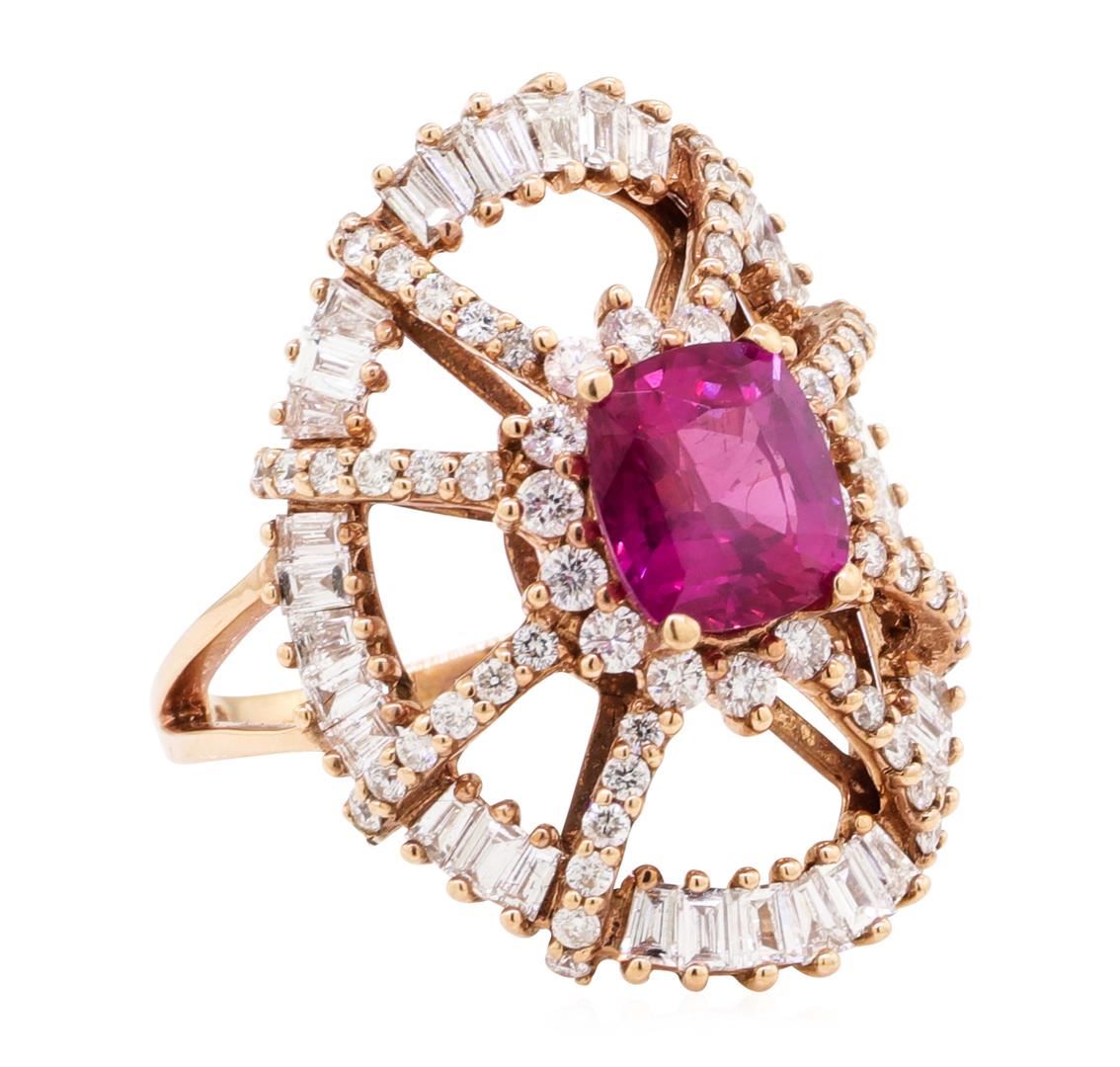 One electronically tested 14KT rose gold lady's cast fashion ring with a starburst oval halo with a bright polish finish. The featured lady's ring has a shank measuring 1.30 millimeters wide. Identified with markings of '14K'. Condition is new, good workmanship. Containing: One prong set rectangular cushion modified mixed cut natural purple sapphire, measuring 7.56 x 6.76 x 4.56mm, (depth est.) approximate weight of 2.09ct., clarity is eye clean, medium dark, strong, purple red color, (GIA PR 6/5), cut is very good. Transmitting light with no distortion, transparent. Colored gemstones are presumed to have been subjected to commonly used enhancement processes. Indications of laboratory high temperature heat treatment. Gradedin the setting in the GIA Laboratory, Report #6173231034. Thirty-Two prong set baguette cut (tapered) diamonds, measuring from 2.00 x 1.20 x 1.02mm (depth est.) to 2.20 x 1.50 x 1.28mm (depth est.) approximate total weight of 32 Stones = 0.89ct. Graded in the setting. Color H - I Clarity VS-2 to SI-1 Cut Good Fourteen prong set round brilliant cut diamonds, measuring 1.80 - 1.75 x 1.10mm (depth est.) approximate total weight of 14 Stones = 0.30ct. Graded in the setting. Color H - I Clarity SI-1 to SI-2 Cut Good Fifty-Six prong set round brilliant cut diamonds, measuring 1.10 - 1.00 x 0.65mm (depth est.) approximate total weight of 56 Stones = 0.24ct. Graded in the setting. Color H - I Clarity SI-1 to SI-2 Cut Good. Total Weight of Colored Stones 2.09ct.. Total Weight of Diamonds 1.43ct.. Total Weight of Ring 5.90gm GAS Appraised at $13710.00. GAS Appraised.