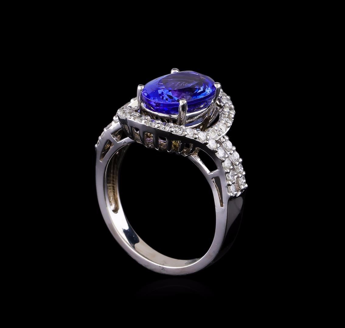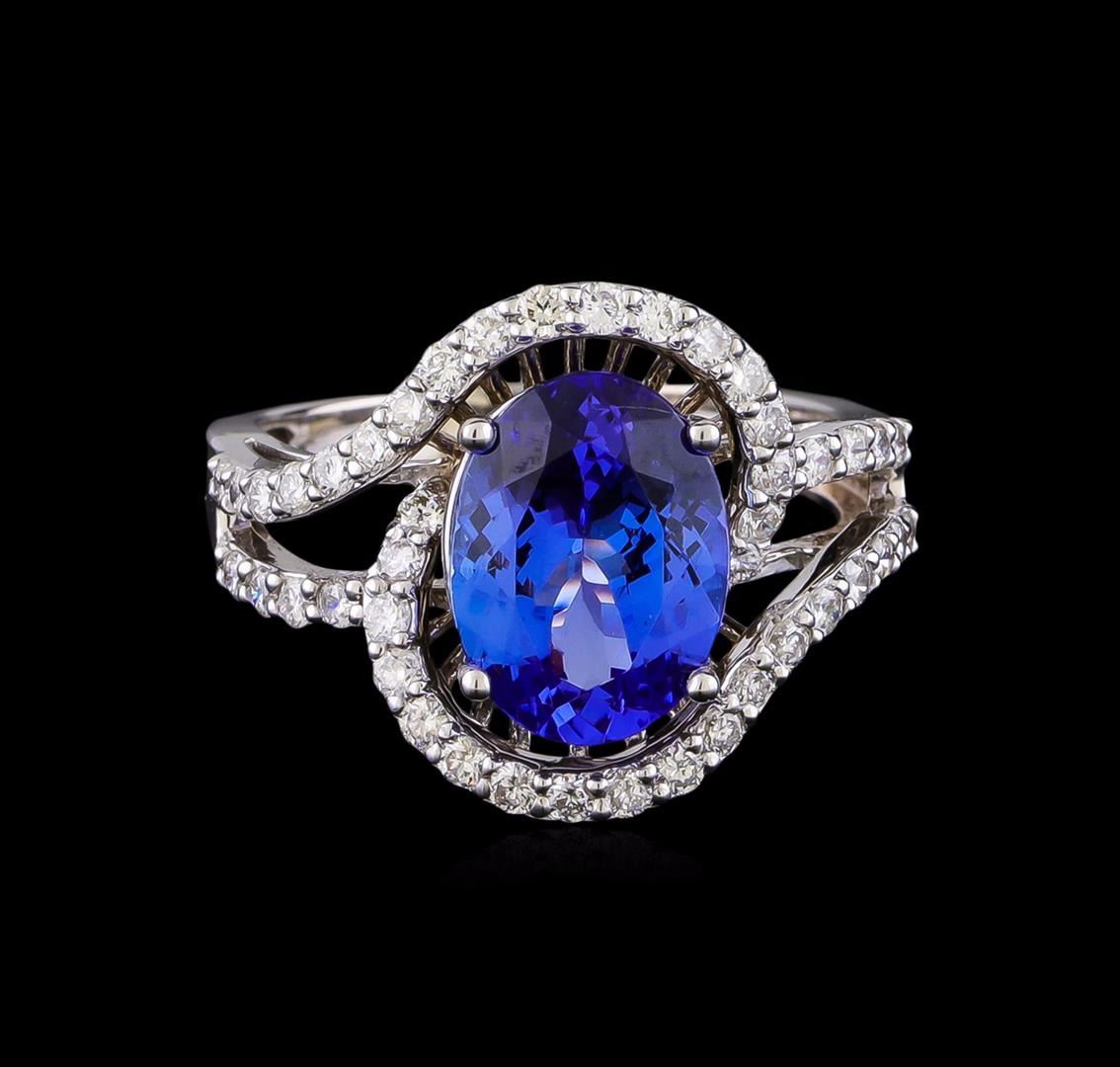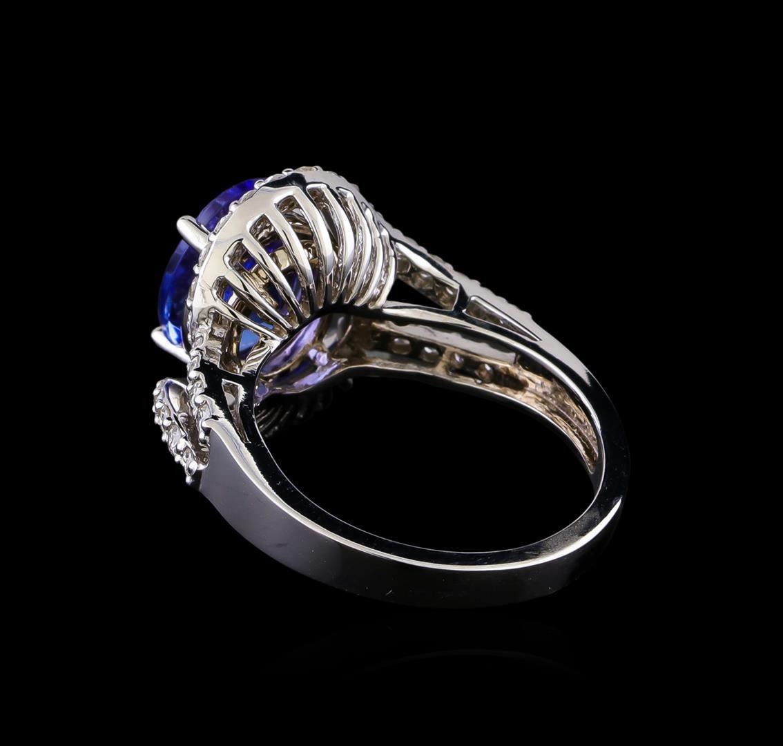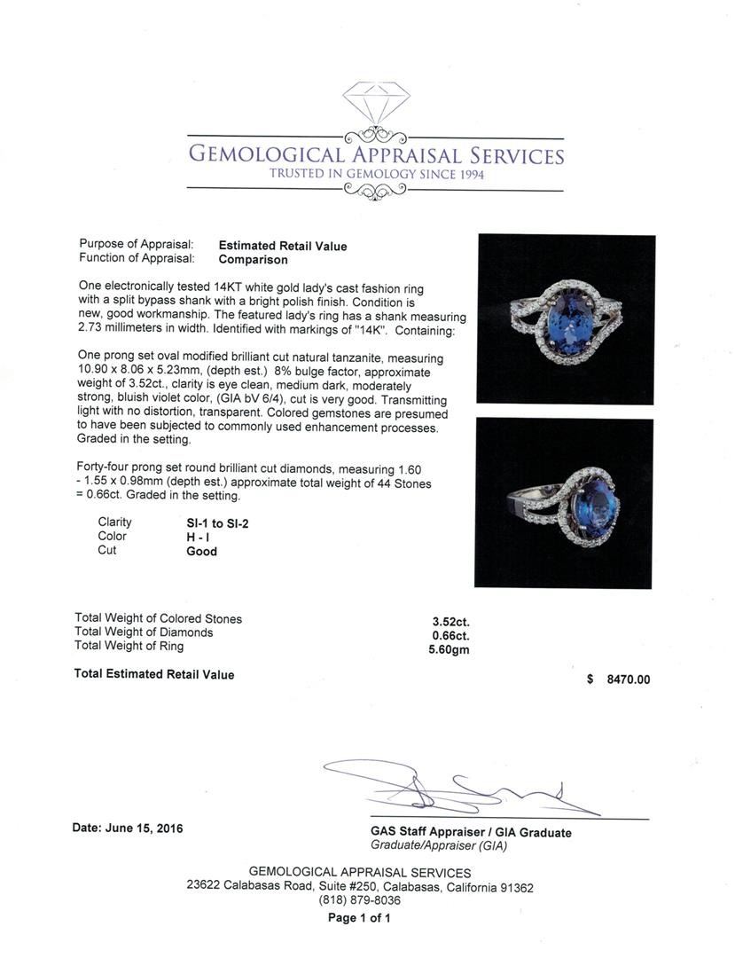 One electronically tested 14KT white gold lady's cast fashion ring with a split bypass shank with a bright polish finish. The featured lady's ring has a shank measuring 2.73 millimeters in width. Identified with markings of "14K". Condition is new, good workmanship. Containing: One prong set oval modified brilliant cut natural tanzanite, measuring 10.90 x 8.06 x 5.23mm, (depth est.) 8%. bulge factor, approximate weight of 3.52ct., clarity is eye clean, medium dark, moderately strong, bluish violet color, (GIA bV 6/4), cut is very good. Transmitting light with no distortion, transparent. Colored gemstones are presumed to have been subjected to commonly used enhancement processes. Graded in the setting. Forty-Four prong set round brilliant cut diamonds, measuring 1.60 - 1.55 x 0.98mm (depth est.) approximate total weight of 44 Stones = 0.66ct. Graded in the setting. Clarity: SI-1 to SI-2. Color: H - I. Cut Good. Total Weight of Colored Stones 3.52ct. Total Weight of Diamonds 0.66ct. Total Weight of Ring 5.60gm. GAS Appraised at $8,470.00.