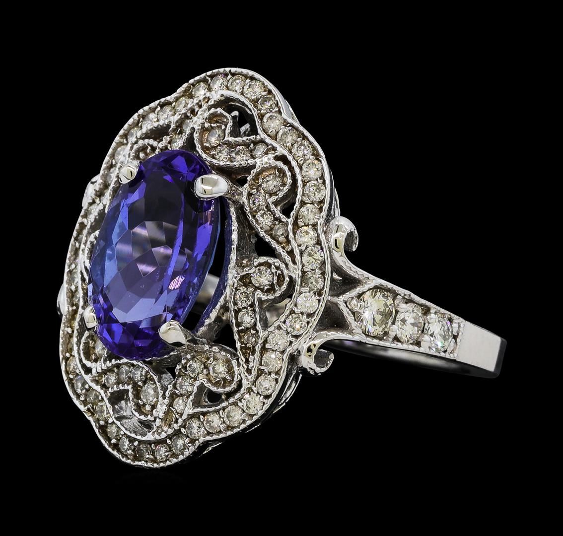 One electronically tested 14KT white gold lady's cast vintage style fashion ring with a scalloped basket halo with a bright polish with milgrain detailing finish. The featured lady's ring has a shank measuring 1.90 millimeters wide. Identified with markings of 'K14'. Condition is new, good workmanship. Containing: One prong set oval modified brilliant cut natural tanzanite, measuring 11.43 x 7.35 x 5.26mm, (depth est.) 13%. bulge factor, approximate weight of 3.52ct., clarity is eye clean, medium, very slightly grayish, violetish blue color, (GIA vB 5/3), cut is very good. Transmitting light with no distortion, transparent. Colored gemstones are presumed to have been subjected to commonly used enhancement processes. Graded in the setting. Six prong set round brilliant cut diamonds, measuring 2.40 - 2.10 x 1.40mm (depth est.) approximate total weight of 6 Stones = 0.26ct. Graded in the setting. Clarity VS-2 to SI-2. Color: H - I Cut Good Fifty-Four prong set round brilliant cut diamonds, measuring 1.20 - 1.15 x 0.73mm (depth est.) approximate total weight of 54 Stones = 0.33ct. Graded in the setting. Clarity SI-1 to I-2. Color: H - J Cut Good Twenty-Four prong set round brilliant cut diamonds, measuring 1.10 - 1.05 x 0.67mm (depth est.) approximate total weight of 24 Stones = 0.12ct. Graded in the setting. Clarity SI-1 to I-1. Color: H - I Cut Good. Total Weight of Colored Stones 3.52ct.. Total Weight of Diamonds 0.71ct.. Total Weight of Ring 8.30gm. GAS Appraised at $8,995.00.