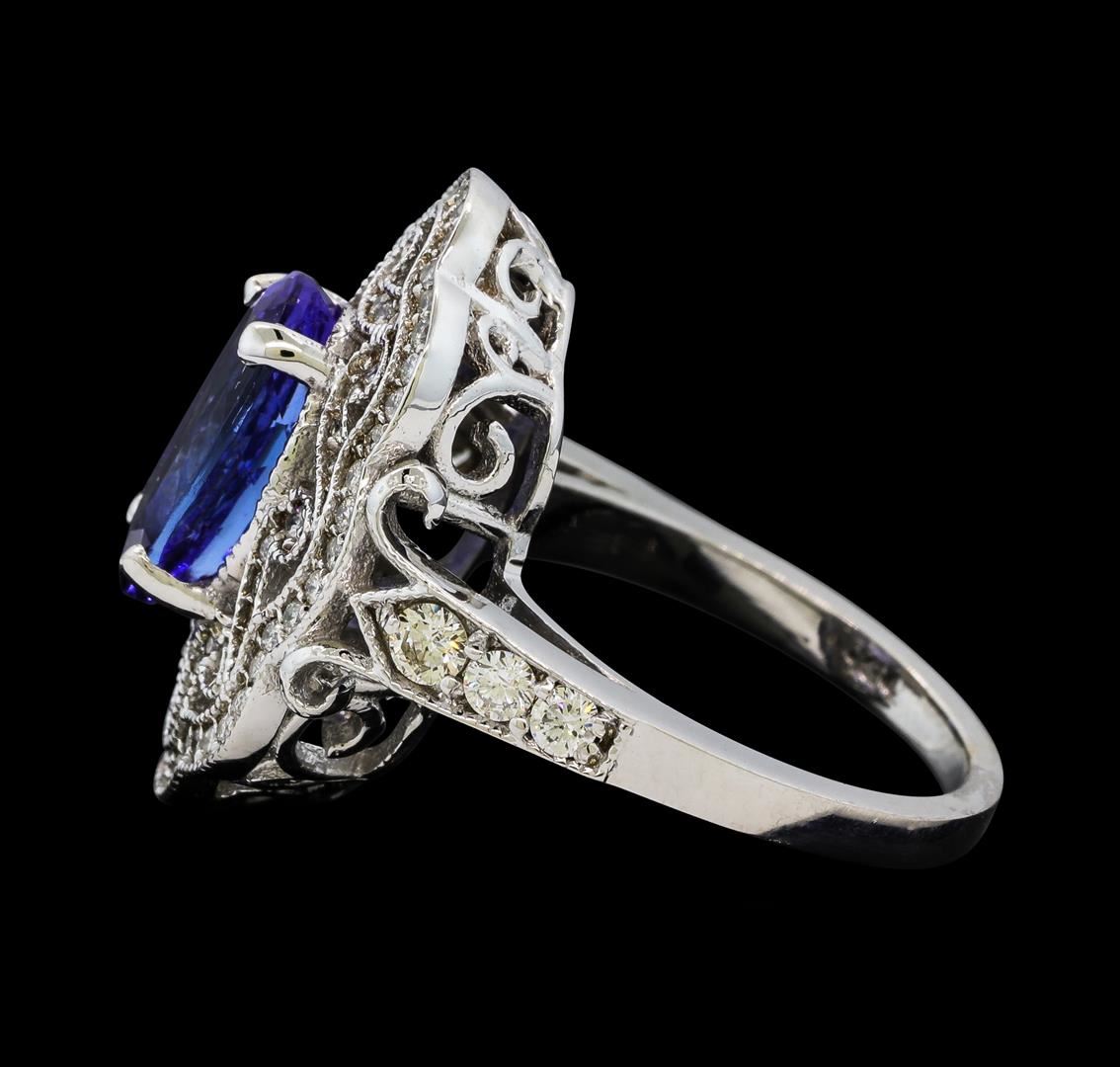 One electronically tested 14KT white gold lady's cast vintage style fashion ring with a scalloped basket halo with a bright polish with milgrain detailing finish. The featured lady's ring has a shank measuring 1.90 millimeters wide. Identified with markings of 'K14'. Condition is new, good workmanship. Containing: One prong set oval modified brilliant cut natural tanzanite, measuring 11.43 x 7.35 x 5.26mm, (depth est.) 13%. bulge factor, approximate weight of 3.52ct., clarity is eye clean, medium, very slightly grayish, violetish blue color, (GIA vB 5/3), cut is very good. Transmitting light with no distortion, transparent. Colored gemstones are presumed to have been subjected to commonly used enhancement processes. Graded in the setting. Six prong set round brilliant cut diamonds, measuring 2.40 - 2.10 x 1.40mm (depth est.) approximate total weight of 6 Stones = 0.26ct. Graded in the setting. Clarity VS-2 to SI-2. Color: H - I Cut Good Fifty-Four prong set round brilliant cut diamonds, measuring 1.20 - 1.15 x 0.73mm (depth est.) approximate total weight of 54 Stones = 0.33ct. Graded in the setting. Clarity SI-1 to I-2. Color: H - J Cut Good Twenty-Four prong set round brilliant cut diamonds, measuring 1.10 - 1.05 x 0.67mm (depth est.) approximate total weight of 24 Stones = 0.12ct. Graded in the setting. Clarity SI-1 to I-1. Color: H - I Cut Good. Total Weight of Colored Stones 3.52ct.. Total Weight of Diamonds 0.71ct.. Total Weight of Ring 8.30gm. GAS Appraised at $8,995.00.