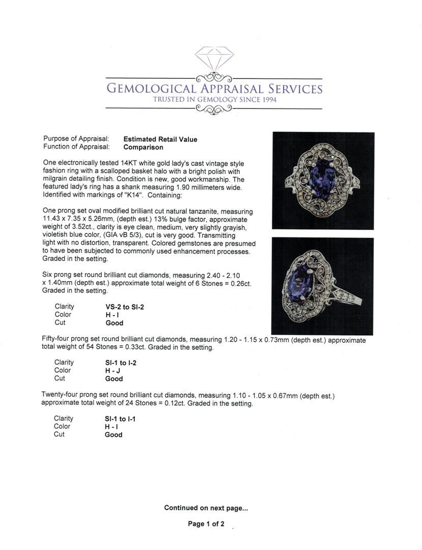 One electronically tested 14KT white gold lady's cast vintage style fashion ring with a scalloped basket halo with a bright polish with milgrain detailing finish. The featured lady's ring has a shank measuring 1.90 millimeters wide. Identified with markings of 'K14'. Condition is new, good workmanship. Containing: One prong set oval modified brilliant cut natural tanzanite, measuring 11.43 x 7.35 x 5.26mm, (depth est.) 13%. bulge factor, approximate weight of 3.52ct., clarity is eye clean, medium, very slightly grayish, violetish blue color, (GIA vB 5/3), cut is very good. Transmitting light with no distortion, transparent. Colored gemstones are presumed to have been subjected to commonly used enhancement processes. Graded in the setting. Six prong set round brilliant cut diamonds, measuring 2.40 - 2.10 x 1.40mm (depth est.) approximate total weight of 6 Stones = 0.26ct. Graded in the setting. Clarity VS-2 to SI-2. Color: H - I Cut Good Fifty-Four prong set round brilliant cut diamonds, measuring 1.20 - 1.15 x 0.73mm (depth est.) approximate total weight of 54 Stones = 0.33ct. Graded in the setting. Clarity SI-1 to I-2. Color: H - J Cut Good Twenty-Four prong set round brilliant cut diamonds, measuring 1.10 - 1.05 x 0.67mm (depth est.) approximate total weight of 24 Stones = 0.12ct. Graded in the setting. Clarity SI-1 to I-1. Color: H - I Cut Good. Total Weight of Colored Stones 3.52ct.. Total Weight of Diamonds 0.71ct.. Total Weight of Ring 8.30gm. GAS Appraised at $8,995.00.