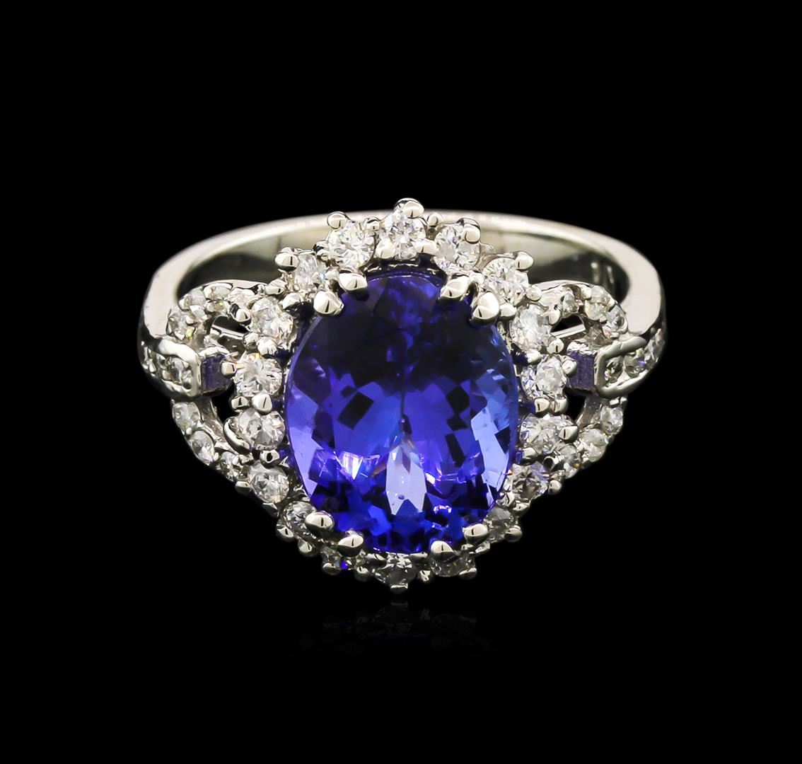 One electronically tested 14KT white gold lady's cast fashion ring with a basket halo with a bright polish finish. The featured lady's ring has a shank measuring 2.55 millimeters wide. Identified with markings of "K14". Condition is new, good workmanship. Containing: Eighteen prong set round brilliant cut diamonds, measuring 1.90 - 1.80 x 1.11mm (depth est.) approximate total weight of 18 Stones = 0.42ct. Graded in the setting. Clarity: SI-2 to I-1. Color: H - I. Cut Good Twenty-Eight prong set round brilliant cut diamonds, measuring 1.30 - 1.20 x 0.75mm (depth est.) approximate total weight of 28 Stones = 0.20ct. Graded in the setting. Clarity: SI-2 to I-1. Color: H - I. Cut Good One prong set oval modified brilliant cut natural tanzanite, measuring 10.94 x 8.77 x 5.54mm, approximate weight of 3.52ct., clarity is eye clean, type I, dark, moderately strong, violetish blue color, (GIA vB 7/4), cut is very good. Transmitting light with no distortion, transparent. Colored gemstones are presumed to have been subjected to commonly used enhancement processes. Graded in the setting. Total Weight of Colored Stones 3.52ct. Total Weight of Diamonds 0.62ct. Total Weight of Ring 4.10gm. GAS Appraised at $7,375.00.