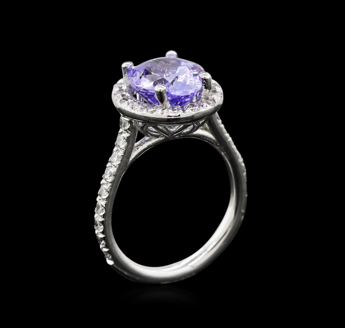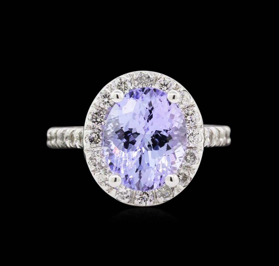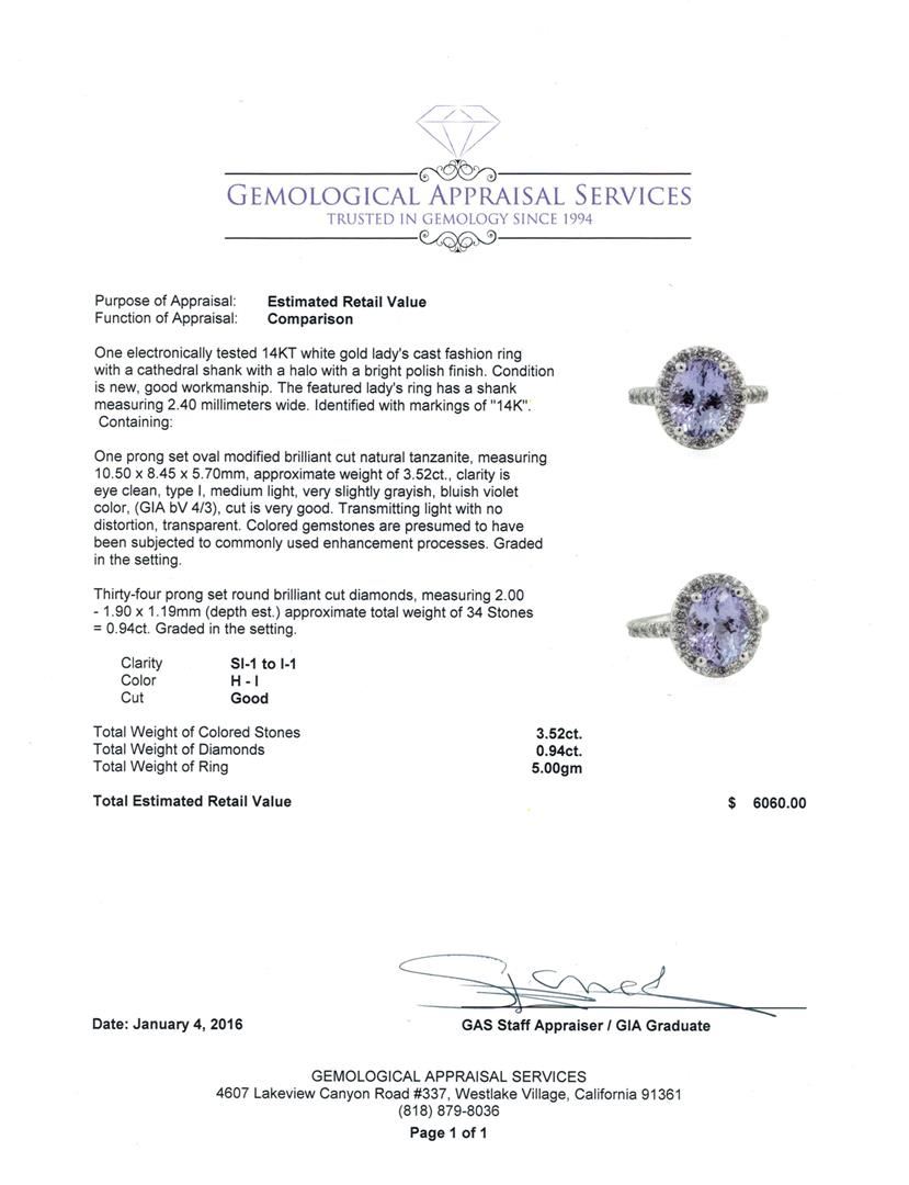 One electronically tested 14KT white gold lady's cast fashion ring with a cathedral shank with a halo with a bright polish finish. The featured lady's ring has a shank measuring 2.40 millimeters wide. Identified with markings of "14K". Condition is new, good workmanship. Containing: One prong set oval modified brilliant cut natural tanzanite, measuring 10.50 x 8.45 x 5.70mm, approximate weight of 3.52ct., clarity is eye clean, type I, medium light, very slightly grayish, bluish violet color, (GIA bV 4/3), cut is very good. Transmitting light with no distortion, transparent. Colored gemstones are presumed to have been subjected to commonly used enhancement processes. Graded in the setting. Thirty-Four prong set round brilliant cut diamonds, measuring 2.00 - 1.90 x 1.19mm (depth est.) approximate total weight of 34 Stones = 0.94ct. Graded in the setting. Clarity: SI-1 to I-1. Color: H - I. Cut Good. Total Weight of Colored Stones 3.52ct. Total Weight of Diamonds 0.94ct. Total Weight of Ring 5.00gm. GAS Appraised at $6,060.00.