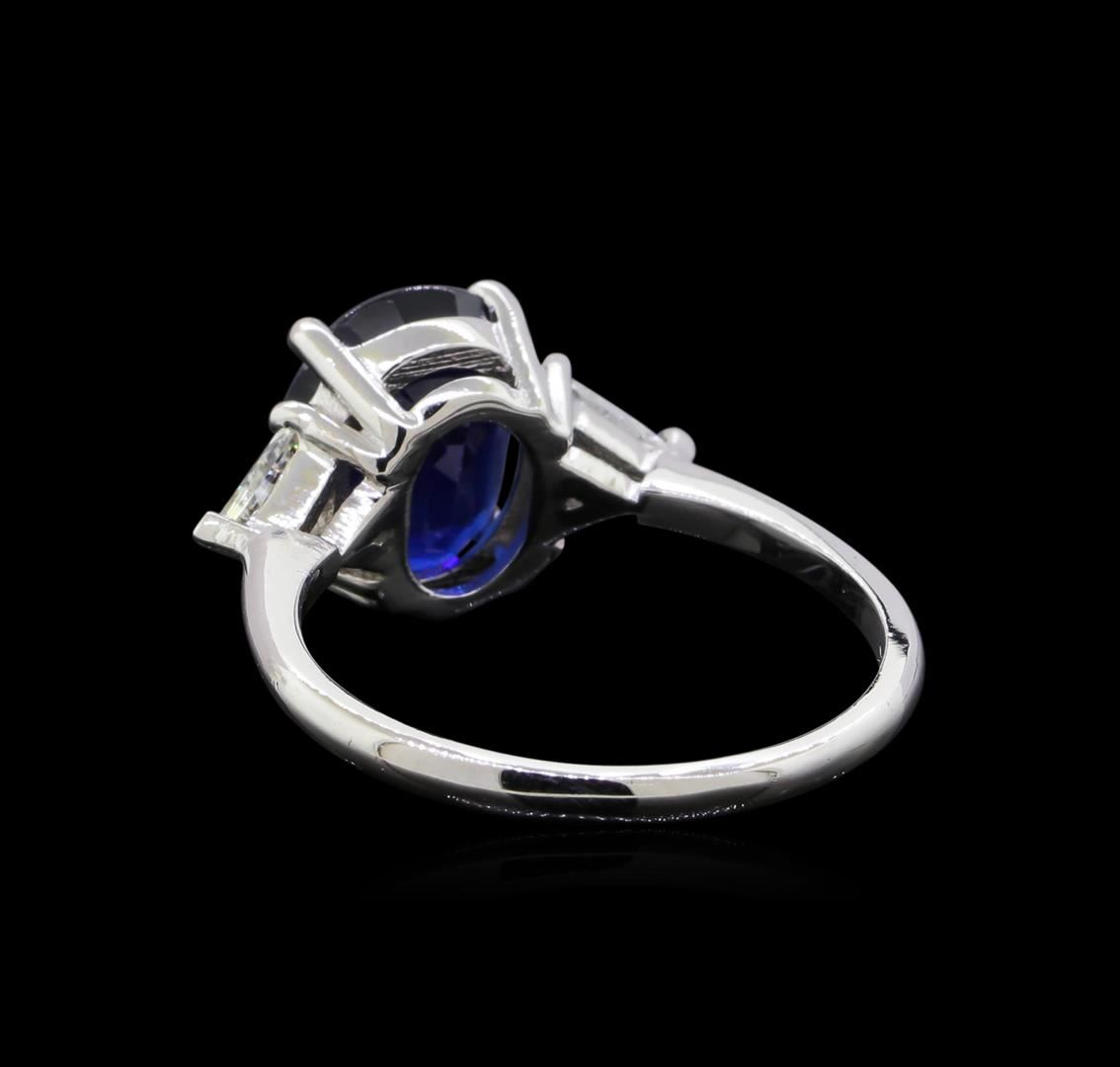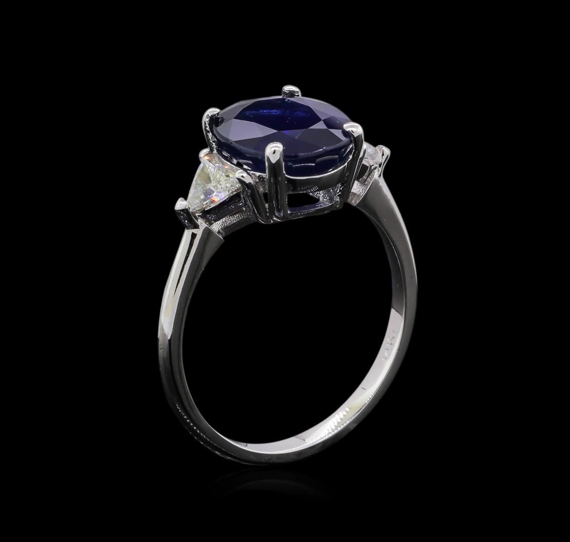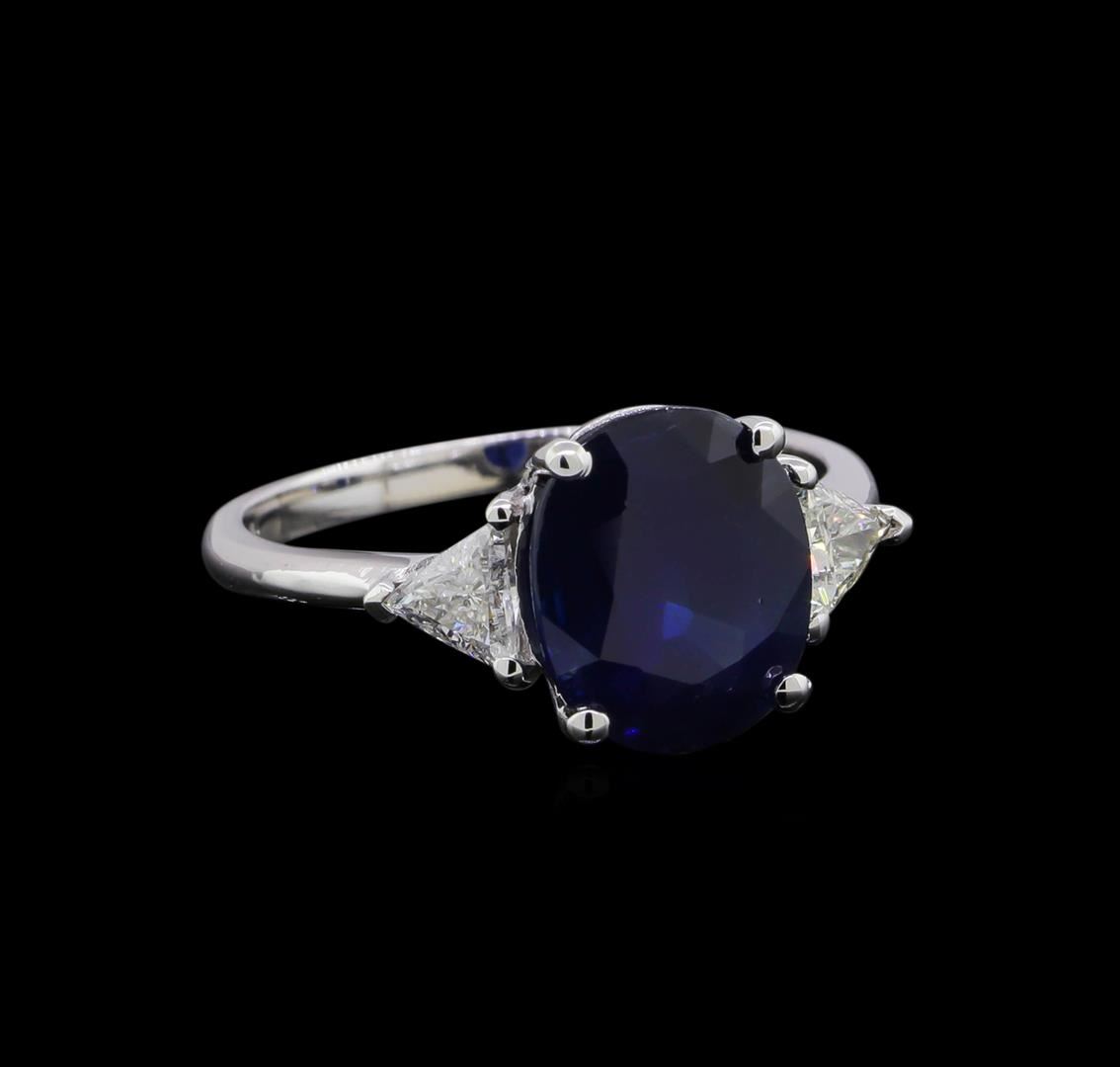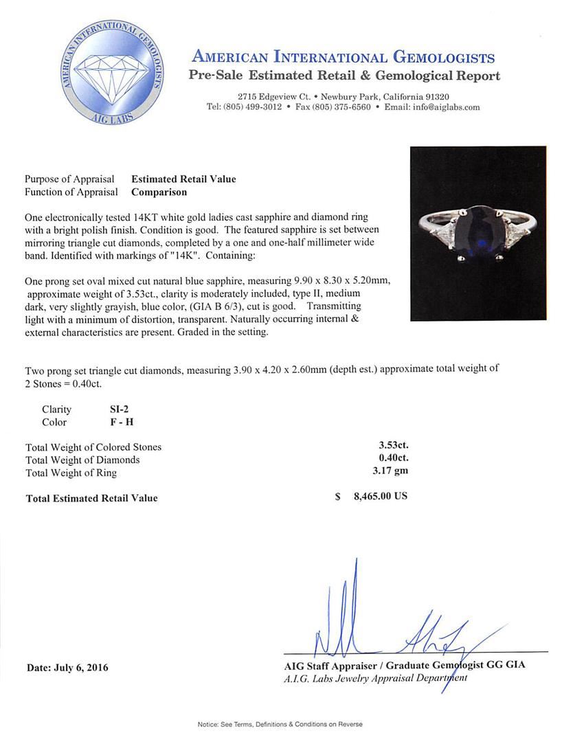 One electronically tested 14KT white gold ladies cast sapphire and diamond ring with a bright polish finish. The featured sapphire is set between mirroring triangle cut diamonds, completed by a one and one-half millimeter wide band. Identified with markings of "14K". Condition is good. Containing: One prong set oval mixed cut natural blue sapphire, measuring 9.90 x 8.30 x 5.20mm, approximate weight of 3.53ct., clarity is moderately included, type II, medium dark, very slightly grayish, blue color, (GIA B 6/3), cut is good. Transmitting light with a minimum of distortion, transparent. Naturally occurring internal & external characteristics are present. Graded in the setting. Two prong set triangle cut diamonds, measuring 3.90 x 4.20 x 2.60mm (depth est.) approximate total weight of 2 Stones = 0.40ct. Clarity: SI-2. Color: F - H. Total Weight of Colored Stones 3.53ct. Total Weight of Diamonds 0.40ct. Total Weight of Ring 3.17gm. AIG Appraised at $8,465.00.