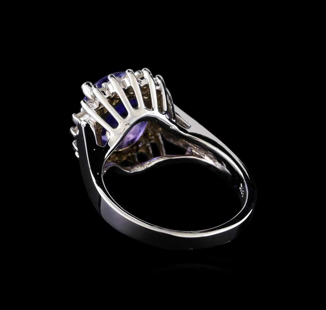 One electronically tested 14KT white gold lady's cast fashion ring with a basket halo with a bright polish finish. The featured lady's ring has a shank measuring 2.60 millimeters in width. Identified with markings of "14K". Condition is new, good workmanship. Containing: One prong set oval modified brilliant cut natural tanzanite, measuring 10.96 x 8.79 x 5.30mm, (depth est.) approximate weight of 3.53ct., clarity is eye clean, medium, moderately strong, bluish violet color, (GIA bV 5/4), cut is very good. Transmitting light with no distortion, transparent. Colored gemstones are presumed to have been subjected to commonly used enhancement processes. Graded in the setting. Eighteen prong set round brilliant cut diamonds, measuring 2.10 - 2.00 x 1.27mm (depth est.) approximate total weight of 18 Stones = 0.54ct. Graded in the setting. Clarity: SI-1 to SI-2. Color: H - I. Cut Good. Total Weight of Colored Stones 3.53ct. Total Weight of Diamonds 0.54ct. Total Weight of Ring 7.10gm. GAS Appraised at $7,775.00.
