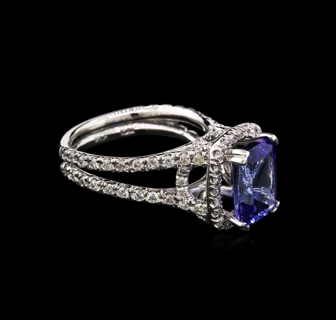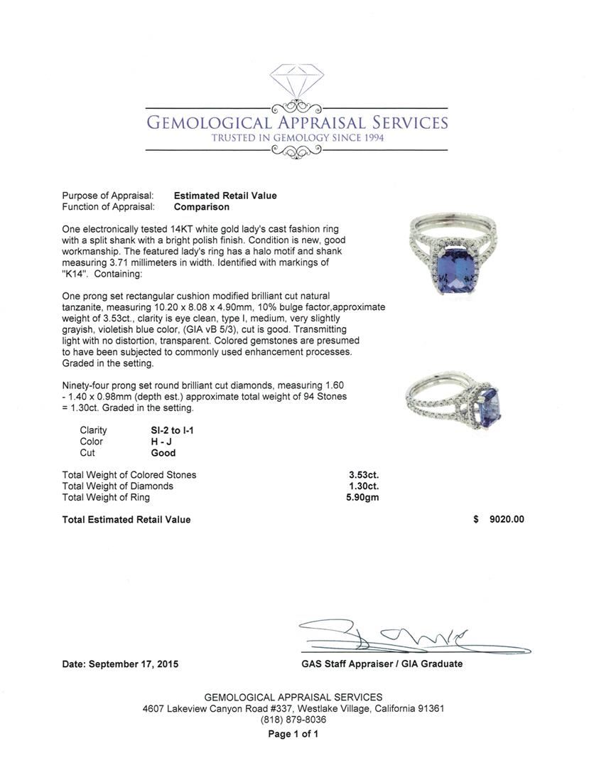 One electronically tested 14KT white gold lady's cast fashion ring with a split shank with a bright polish finish. The featured lady's ring has a halo motif and shank measuring 3.71 millimeters in width. Identified with markings of "K14". Condition is new, good workmanship. Containing: One prong set rectangular cushion modified brilliant cut natural tanzanite, measuring 10.20 x 8.08 x 4.90mm, 10% bulge factor, approximate weight of 3.53ct., clarity is eye clean, type I, medium, very slightly grayish, violetish blue color, (GIA vB 5/3), cut is good. Transmitting light with no distortion, transparent. Colored gemstones are presumed to have been subjected to commonly used enhancement processes. Graded in the setting. Ninety-Four prong set round brilliant cut diamonds, measuring 1.60 - 1.40 x 0.98mm (depth est.) approximate total weight of 94 Stones = 1.30ct. Graded in the setting. Clarity: SI-2 to I-1. Color: H - Good. Total Weight of Colored Stones 3.53ct. Total Weight of Diamonds 1.30ct. Total Weight of Ring 5.90gm. GAS Appraised at $9,020.00.