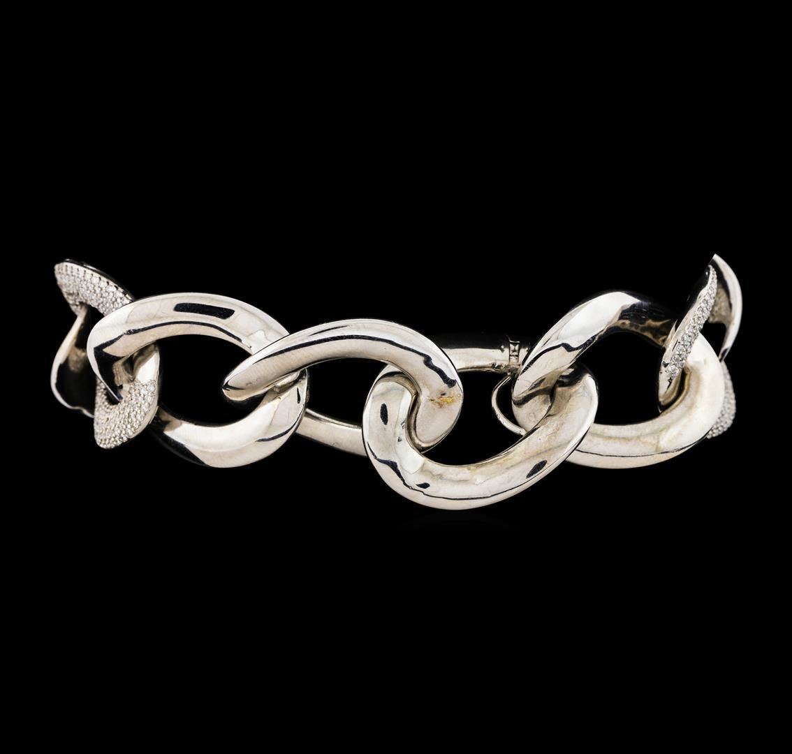 One electronically tested 14KT white gold lady's combination cast & assembled fashion bracelet with a hinged clasp with a bright polish finish. The featured lady's bracelet consist of eleven interlocking, shaped oval links and measures approximately 8 inches in length. Condition is new, good workmanship. Containing: Six Hundred Twelve prong set round brilliant cut diamonds, measuring 1.20 - 1.15 x 0.71mm (depth est.) approximate total weight of 612 Stones = 3.54ct. Graded in the setting. Clarity SI-1 to I-1. Color: H - I Cut Good. Total Weight of Diamonds 3.54ct.. Total Weight of Bracelet 41.60gm. GAS Appraised at $14,305.00.