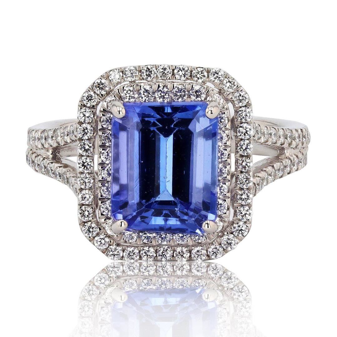 One polished, stamped, and tested platinum ring with a bright finish. The ring is mounted with: 1 genuine tanzanite center stone weigh-ing approximately 3.54 carat, and 134 genuine round diamonds weighing approximately 0.67 carats. This item weighs 7.6 gr