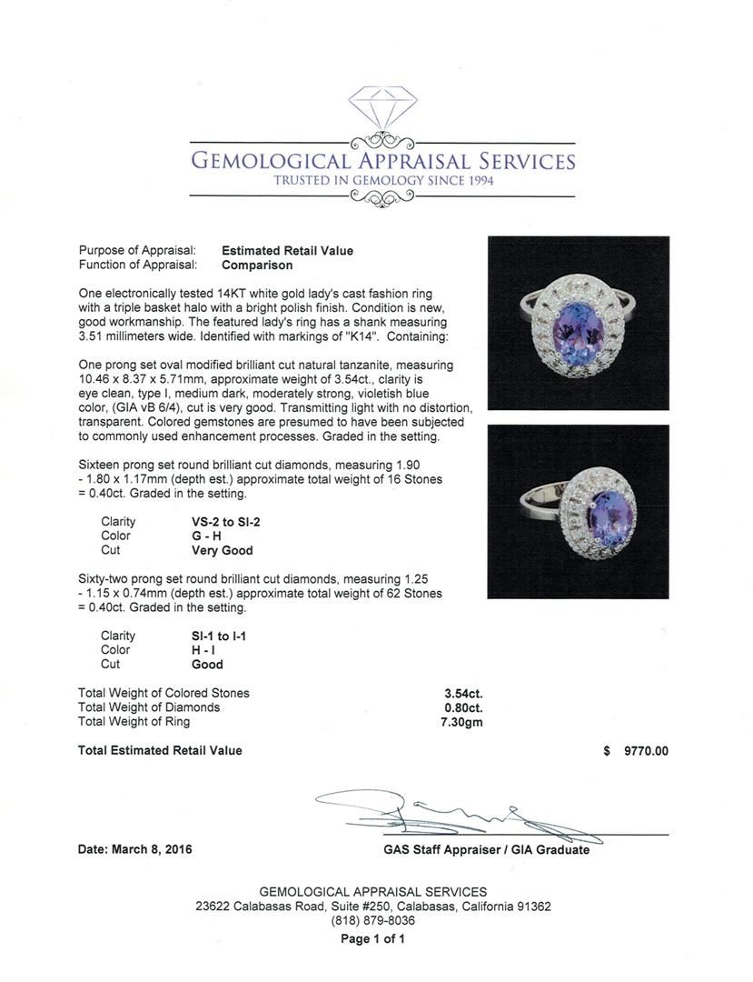 One electronically tested 14KT white gold lady's cast fashion ring with a triple basket halo with a bright polish finish. The featured lady's ring has a shank measuring 3.51 millimeters wide. Identified with markings of "K14". Condition is new, good workmanship. Containing: One prong set oval modified brilliant cut natural tanzanite, measuring 10.46 x 8.37 x 5.71mm, approximate weight of 3.54ct., clarity is eye clean, type I, medium dark, moderately strong, violetish blue color, (GIA vB 6/4), cut is very good. Transmitting light with no distortion, transparent. Colored gemstones are presumed to have been subjected to commonly used enhancement processes. Graded in the setting. Sixteen prong set round brilliant cut diamonds, measuring 1.90 - 1.80 x 1.17mm (depth est.) approximate total weight of 16 Stones = 0.40ct. Graded in the setting. Clarity: VS-2 to SI-2. Color: G - Very Good Sixty-Two prong set round brilliant cut diamonds, measuring 1.25 - 1.15 x 0.74mm (depth est.) approximate total weight of 62 Stones = 0.40ct. Graded in the setting. Clarity: SI-1 to I-1. Color: H - I. Cut Good. Total Weight of Colored Stones 3.54ct. Total Weight of Diamonds 0.80ct. Total Weight of Ring 7.30gm. GAS Appraised at $9,770.00.