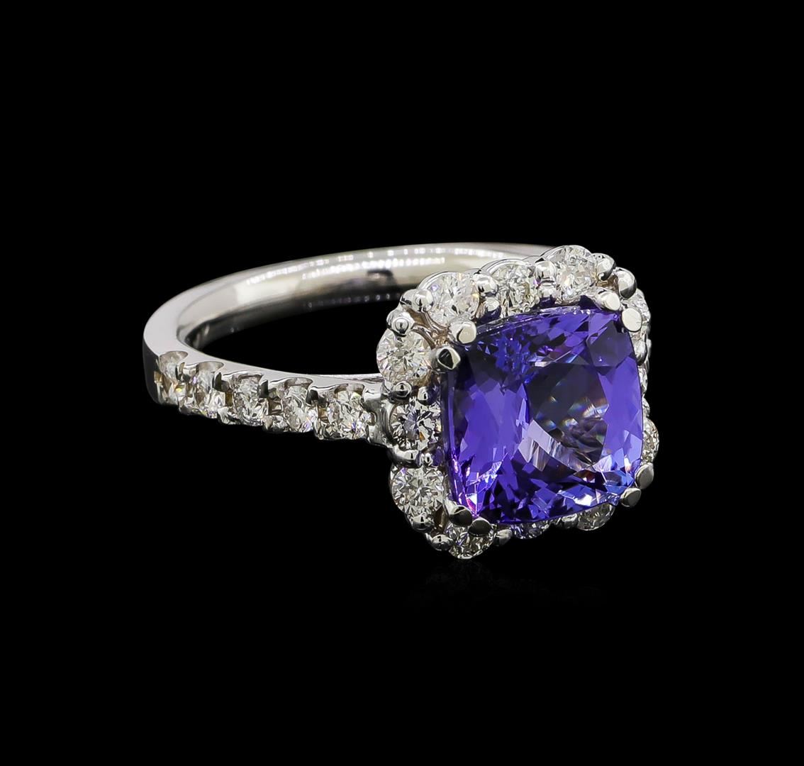 One electronically tested 14KT white gold lady's cast fashion ring with a cathedral halo with a bright polish finish. The featured lady's ring has a shank measuring 2.29 millimeters wide. Identified with markings of '14K'. Condition is new, good workmanship. Containing: One prong set square cushion modified brilliant cut natural tanzanite, measuring 8.75 x 8.73 x 5.52mm, (depth est.) 6%. bulge factor, approximate weight of 3.54ct., clarity is eye clean, medium, moderately strong, violetish blue color, (GIA vB 5/4), cut is very good. Transmitting light with no distortion, transparent. Colored gemstones are presumed to have been subjected to commonly used enhancement processes. Graded in the setting. Twelve prong set round brilliant cut diamonds, measuring 2.40 - 2.30 x 1.46mm (depth est.) approximate total weight of 12 Stones = 0.60ct. Graded in the setting. Clarity SI-1 to I-1. Color: H - I Cut Good Ten prong set round brilliant cut diamonds, measuring 2.10 - 2.00 x 1.27mm (depth est.) approximate total weight of 10 Stones = 0.33ct. Graded in the setting. Clarity SI-1 to SI-2. Color: H - I Cut Good. Total Weight of Colored Stones 3.54ct.. Total Weight of Diamonds 0.93ct.. Total Weight of Ring 5.80gm GAS Appraised at $8,540.00.