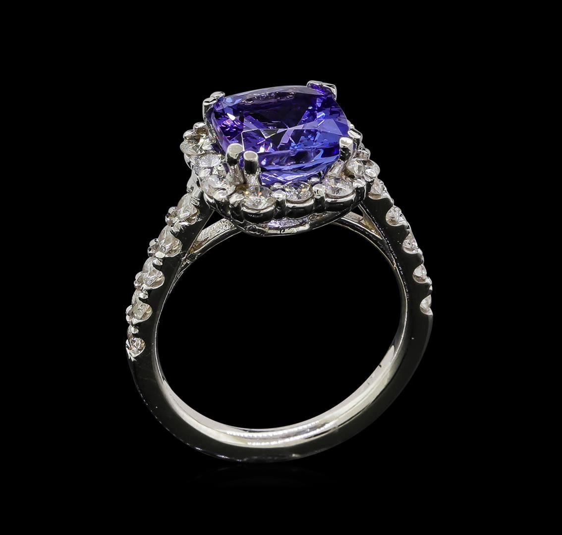 One electronically tested 14KT white gold lady's cast fashion ring with a cathedral halo with a bright polish finish. The featured lady's ring has a shank measuring 2.29 millimeters wide. Identified with markings of '14K'. Condition is new, good workmanship. Containing: One prong set square cushion modified brilliant cut natural tanzanite, measuring 8.75 x 8.73 x 5.52mm, (depth est.) 6%. bulge factor, approximate weight of 3.54ct., clarity is eye clean, medium, moderately strong, violetish blue color, (GIA vB 5/4), cut is very good. Transmitting light with no distortion, transparent. Colored gemstones are presumed to have been subjected to commonly used enhancement processes. Graded in the setting. Twelve prong set round brilliant cut diamonds, measuring 2.40 - 2.30 x 1.46mm (depth est.) approximate total weight of 12 Stones = 0.60ct. Graded in the setting. Clarity SI-1 to I-1. Color: H - I Cut Good Ten prong set round brilliant cut diamonds, measuring 2.10 - 2.00 x 1.27mm (depth est.) approximate total weight of 10 Stones = 0.33ct. Graded in the setting. Clarity SI-1 to SI-2. Color: H - I Cut Good. Total Weight of Colored Stones 3.54ct.. Total Weight of Diamonds 0.93ct.. Total Weight of Ring 5.80gm GAS Appraised at $8,540.00.