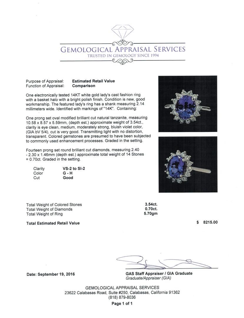 One electronically tested 14KT white gold lady's cast fashion ring with a basket halo with a bright polish finish. The featured lady's ring has a shank measuring 2.14 millimeters wide. Identified with markings of '14K'. Condition is new, good workmanship. Containing: One prong set oval modified brilliant cut natural tanzanite, measuring 10.58 x 8.57 x 5.59mm, (depth est.) approximate weight of 3.54ct., clarity is eye clean, medium, moderately strong, bluish violet color, (GIA bV 5/4), cut is very good. Transmitting light with no distortion, transparent. Colored gemstones are presumed to have been subjected to commonly used enhancement processes. Graded in the setting. Fourteen prong set round brilliant cut diamonds, measuring 2.40 - 2.30 x 1.46mm (depth est.) approximate total weight of 14 Stones = 0.70ct. Graded in the setting. Clarity VS-2 to SI-2. Color: G - H Cut Good. Total Weight of Colored Stones 3.54ct.. Total Weight of Diamonds 0.70ct.. Total Weight of Ring 5.70gm. GAS Appraised at $8,215.00.