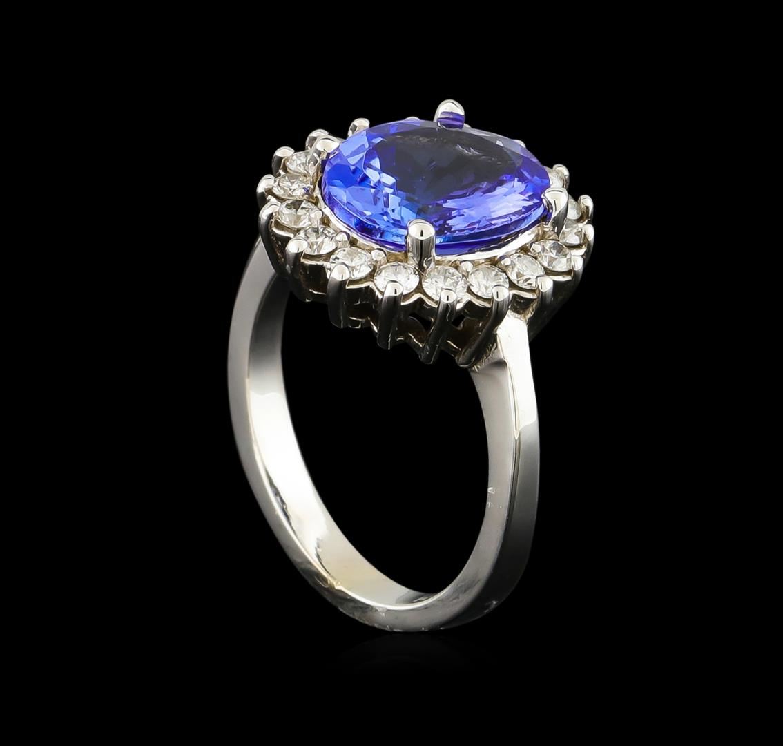 One electronically tested 14KT white gold lady's cast fashion ring with a basket halo with a bright polish finish. The featured lady's ring has a shank measuring 2.77 millimeters wide. Identified with markings of "14K". Condition is new, good workmanship. Containing: One prong set oval modified brilliant cut natural tanzanite, measuring 11.02 x 8.92 x 4.95mm, 4%. bulge factor, approximate weight of 3.54ct., clarity is eye clean, type I, medium dark, moderately strong, violetish blue color, (GIA vB 6/4), cut is very good. Transmitting light with no distortion, transparent. Colored gemstones are presumed to have been subjected to commonly used enhancement processes. Graded in the setting. Eighteen prong set round brilliant cut diamonds, measuring 2.10 - 2.00 x 1.27mm (depth est.) approximate total weight of 18 Stones = 0.60ct. Graded in the setting. Clarity: SI-1 to SI-2. Color: H - I. Cut Good. Total Weight of Colored Stones 3.54ct. Total Weight of Diamonds 0.60ct. Total Weight of Ring 5.80gm. GAS Appraised at $8,315.00.