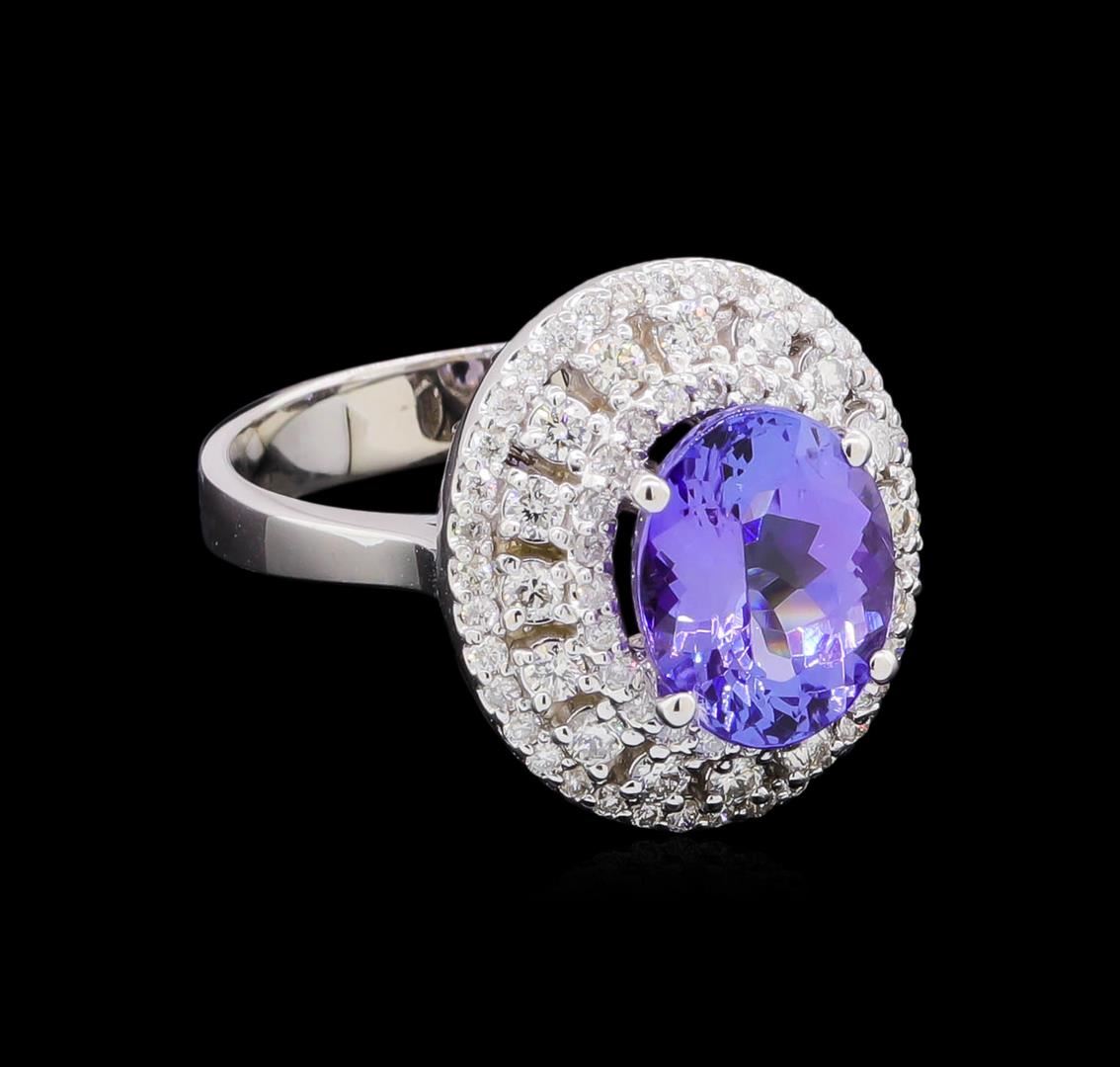One electronically tested 14KT white gold lady's cast fashion ring with a triple basket halo with a bright polish finish. The featured lady's ring has a shank measuring 3.51 millimeters wide. Identified with markings of "K14". Condition is new, good workmanship. Containing: One prong set oval modified brilliant cut natural tanzanite, measuring 10.46 x 8.37 x 5.71mm, approximate weight of 3.54ct., clarity is eye clean, type I, medium dark, moderately strong, violetish blue color, (GIA vB 6/4), cut is very good. Transmitting light with no distortion, transparent. Colored gemstones are presumed to have been subjected to commonly used enhancement processes. Graded in the setting. Sixteen prong set round brilliant cut diamonds, measuring 1.90 - 1.80 x 1.17mm (depth est.) approximate total weight of 16 Stones = 0.40ct. Graded in the setting. Clarity: VS-2 to SI-2. Color: G - Very Good Sixty-Two prong set round brilliant cut diamonds, measuring 1.25 - 1.15 x 0.74mm (depth est.) approximate total weight of 62 Stones = 0.40ct. Graded in the setting. Clarity: SI-1 to I-1. Color: H - I. Cut Good. Total Weight of Colored Stones 3.54ct. Total Weight of Diamonds 0.80ct. Total Weight of Ring 7.30gm. GAS Appraised at $9,770.00.