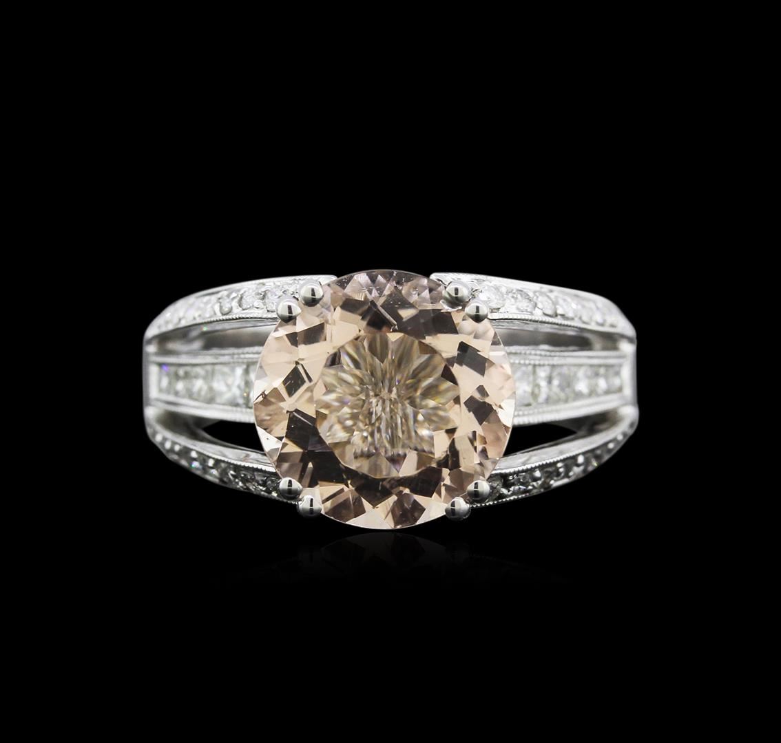 One electronically tested 18KT white gold ladies cast morganite and diamond ring with a bright polish finish. Identified with markings of "18K". Condition is new. Containing: One prong set round modified brilliant cut natural morganite, measuring 10.00 - GGL Appraised at $4,375.00.