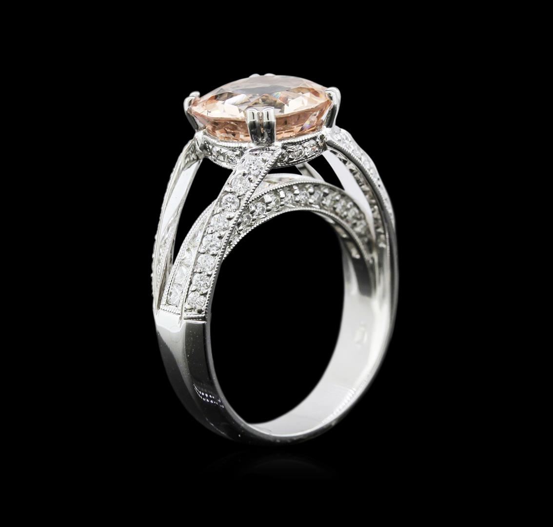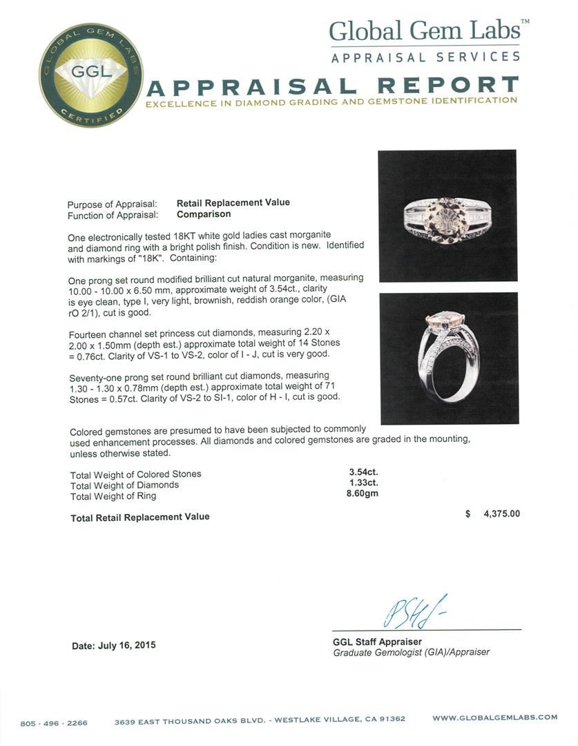 One electronically tested 18KT white gold ladies cast morganite and diamond ring with a bright polish finish. Identified with markings of "18K". Condition is new. Containing: One prong set round modified brilliant cut natural morganite, measuring 10.00 - 10.00 x 6.50 mm, approximate weight of 3.54ct., clarity is eye clean, type I, very light, brownish, reddish orange color, (GIA rO 2/1), cut is good. Fourteen channel set princess cut diamonds, measuring 2.20 x 2.00 x 1.50mm (depth est.) approximate total weight of 14 Stones = 0.76ct. Clarity: VS-1 to VS-2. Color: I - J, Cut is Very Good. Seventy-One prong set round brilliant cut diamonds, measuring 1.30 - 1.30 x 0.78mm (depth est.) approximate total weight of 71 Stones = 0.57ct. Clarity: VS-2 to SI-1. Color: H - I, Cut is Good. Colored gemstones are presumed to have been subjected to commonly used enhancement processes. All diamonds and colored gemstones are graded in the mounting, unless otherwise stated. Total Weight of Colored Stones 3.54ct. Total Weight of Diamonds 1.33ct. Total Weight of Ring 8.60 grams. GGL Appraised at $4,375.00.