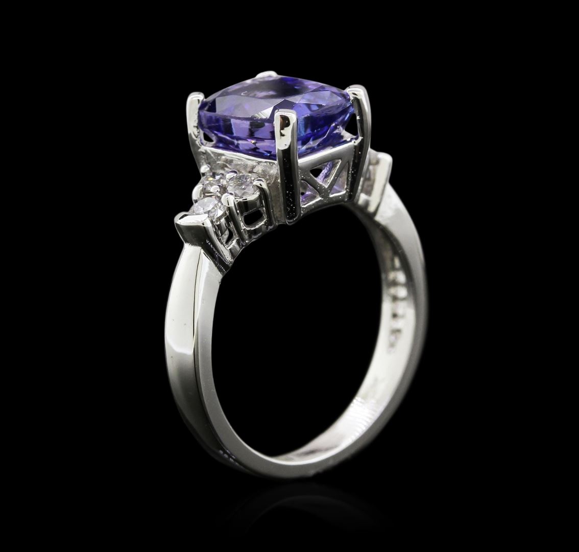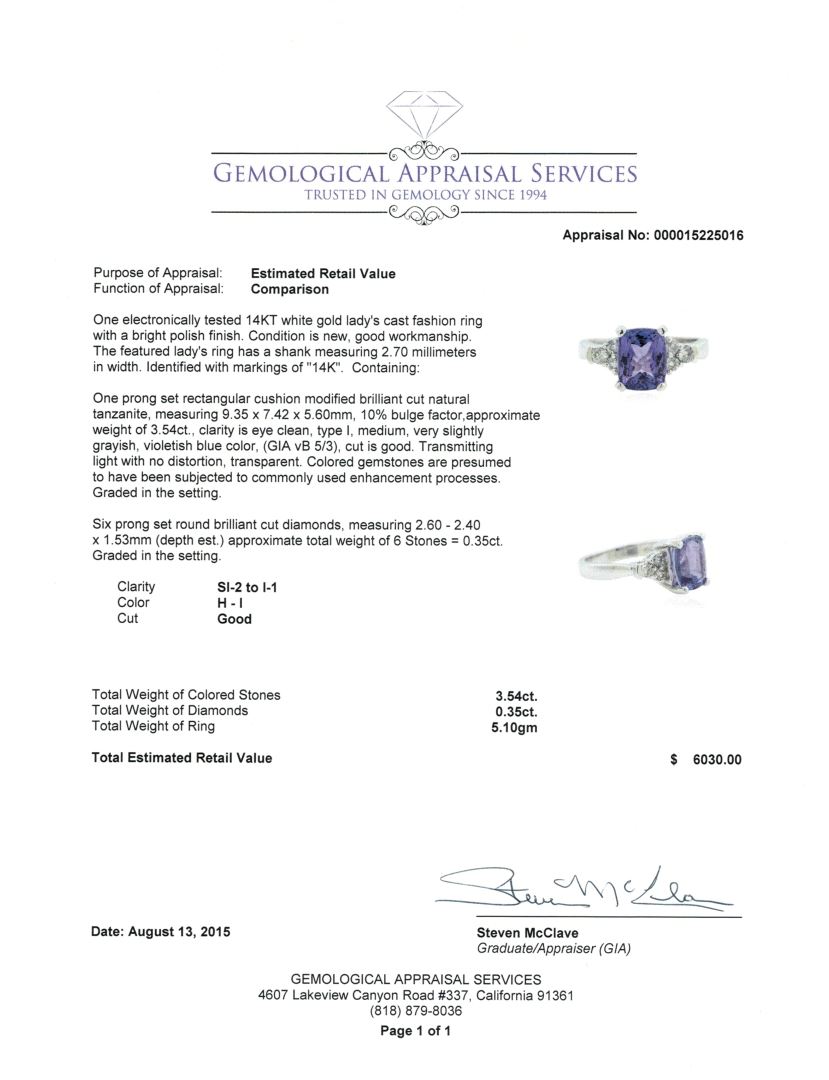 One electronically tested 14KT white gold lady's cast fashion ring with a bright polish finish. The featured lady's ring has a shank measuring 2.70 millimeters in width. Identified with markings of "14K". Condition is new, good workmanship. Containing: One prong set rectangular cushion modified brilliant cut natural tanzanite, measuring 9.35 x 7.42 x 5.60mm, 10% bulge factor, approximate weight of 3.54ct., clarity is eye clean, type I, medium, very slightly grayish, violetish blue color, (GIA vB 5/3), cut is good. Transmitting light with no distortion, transparent. Colored gemstones are presumed to have been subjected to commonly used enhancement processes. Graded in the setting. Six prong set round brilliant cut diamonds, measuring 2.60 - 2.40 x 1.53mm (depth est.) approximate total weight of 6 Stones = 0.35ct. Graded in the setting. Clarity: SI-2 to I-1. Color: H - I. Cut Good. Total Weight of Colored Stones 3.54ct. Total Weight of Diamonds 0.35ct. Total Weight of Ring 5.10gm. GAS Appraised at $6,030.00.