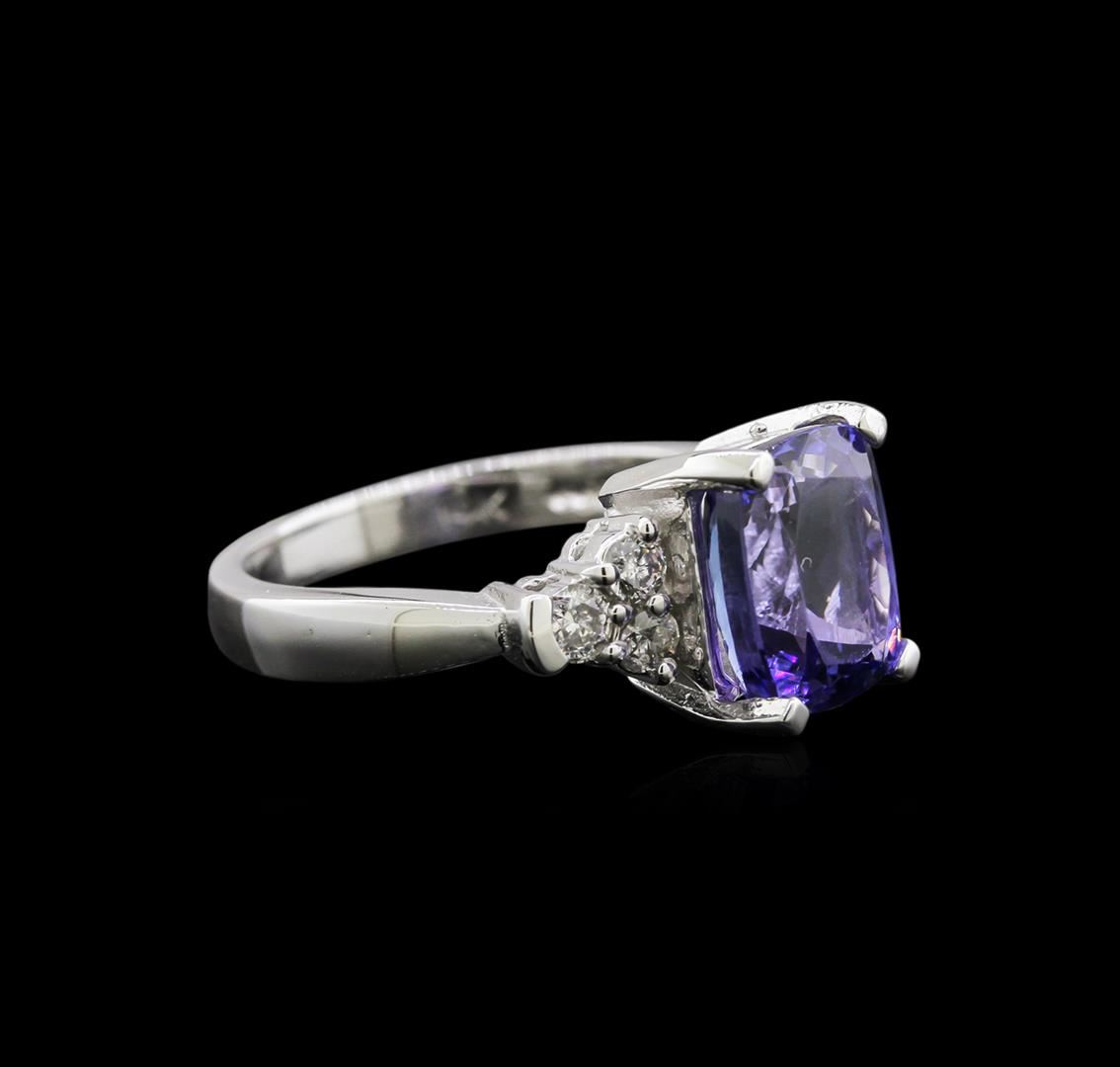 One electronically tested 14KT white gold lady's cast fashion ring with a bright polish finish. The featured lady's ring has a shank measuring 2.70 millimeters in width. Identified with markings of "14K". Condition is new, good workmanship. Containing: One prong set rectangular cushion modified brilliant cut natural tanzanite, measuring 9.35 x 7.42 x 5.60mm, 10% bulge factor, approximate weight of 3.54ct., clarity is eye clean, type I, medium, very slightly grayish, violetish blue color, (GIA vB 5/3), cut is good. Transmitting light with no distortion, transparent. Colored gemstones are presumed to have been subjected to commonly used enhancement processes. Graded in the setting. Six prong set round brilliant cut diamonds, measuring 2.60 - 2.40 x 1.53mm (depth est.) approximate total weight of 6 Stones = 0.35ct. Graded in the setting. Clarity: SI-2 to I-1. Color: H - I. Cut Good. Total Weight of Colored Stones 3.54ct. Total Weight of Diamonds 0.35ct. Total Weight of Ring 5.10gm. GAS Appraised at $6,030.00.
