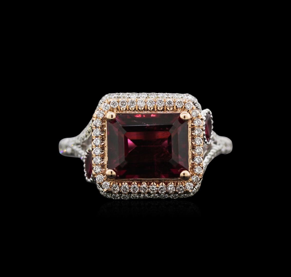 One electronically tested 14KT white and rose gold ladies cast rubellite tourmaline and diamond ring with a bright polish finish. The featured rubellite tourmaline is set within a diamond bezel supported by a diamond accented floral under gallery and diam AIG Appraised at $7,415.00.
