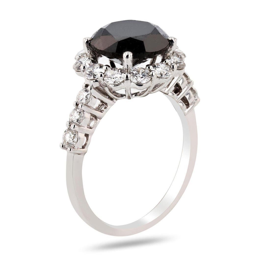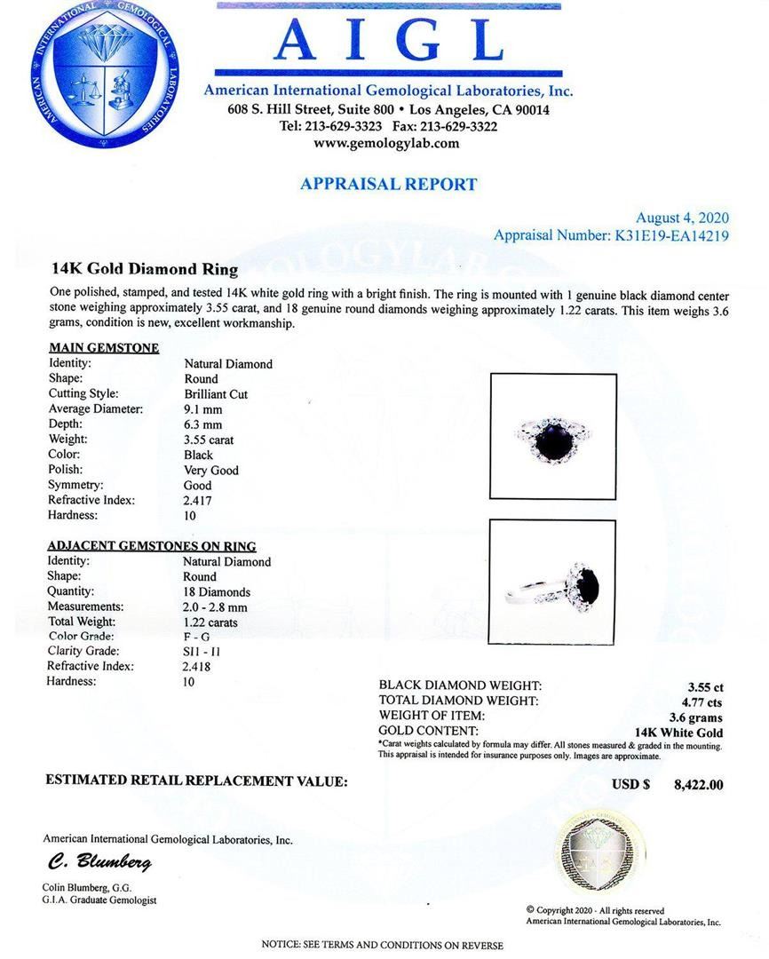 14K Gold Diamond Ring One polished, stamped, and tested 14K white gold ring with a bright finish. The ring is mounted with I genuine black diamond center stone weighing approximately 3.55 carat, and 18 genuine round diamonds weighing approximately 1.22 carats. This item weighs 3.6 grams, condition is new, excellent workmanship. MAIN GEMSTONE Identity: Natural Diamond Shape: Round Cutting Style: Brilliant Cut Average Diameter: 9.1mm Depth: 6.3mm Weight: 3.55 carat Color: Black Polish: Very Good Symmetry: Good Refractive Index: 2.417 Hardness: 10 ADJACENT GEMSTONES ON RING Identity: Natural Diamond Shape: Round Quantity: 18 Diamonds Measurements: 2.0 - 2.8mm Total Weight: 1.22 carats Color Grade: F - G Clarity Grade: SI1 to I1 Refractive Index: 2.418 Hardness: 10 BLACK DIAMOND WEIGHT: 3.55ct TOTAL DIAMOND WEIGHT: 4.77ctw WEIGHT OF ITEM: 3.6 grams GOLD CONTENT: 14K White Gold