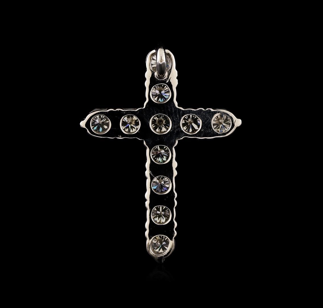 One electronically tested 18KT white gold cast diamond Cross pendant. The pendant features a rigid diamond ribbon cross, completed by a hidden bail. Measurements are one and one-half inches long by one inch wide. Bright polish finish. Condition is good. Containing: Eleven prong set round brilliant cut diamonds, measuring 4.60 - 4.30 x 2.67mm (depth est.) approximate total weight of 11 Stones = 3.55ct. Graded in the setting. Clarity SI-1 to I-1. Color: G - I. Total Weight of Diamonds 3.55ct.. Total Weight of Pendant 6.46gm. AIG Appraised at $17,720.00.