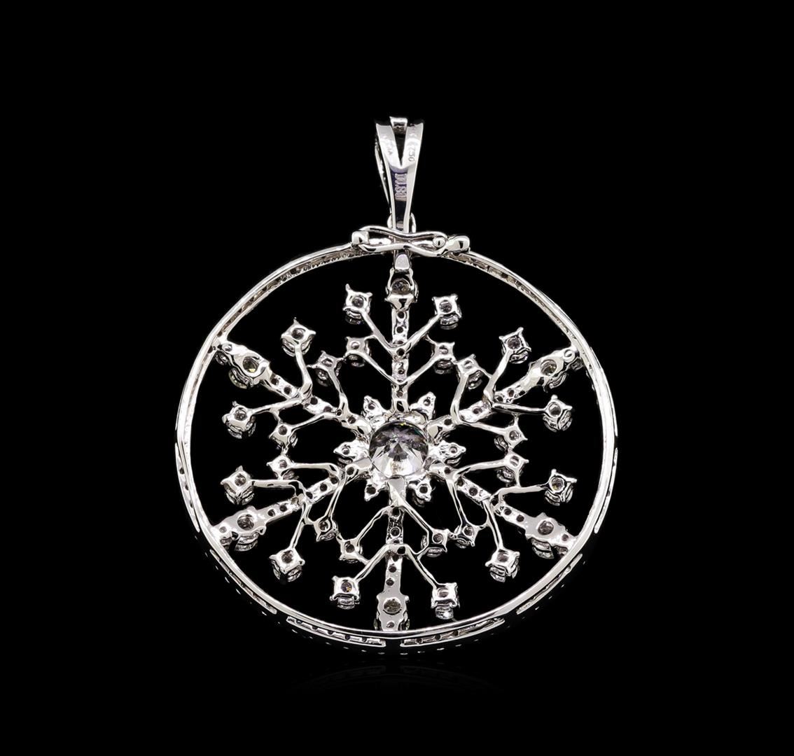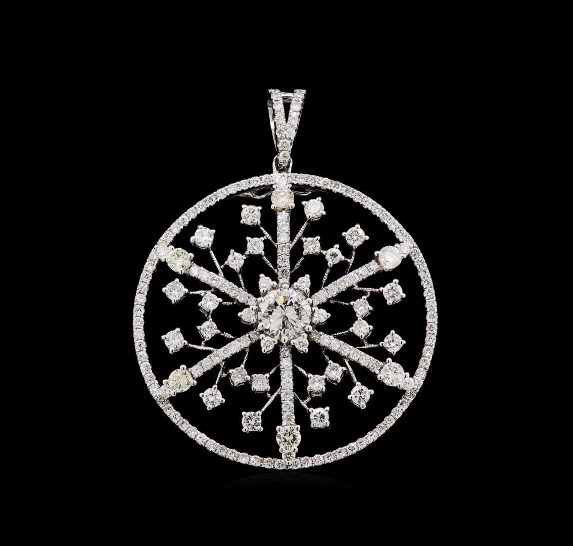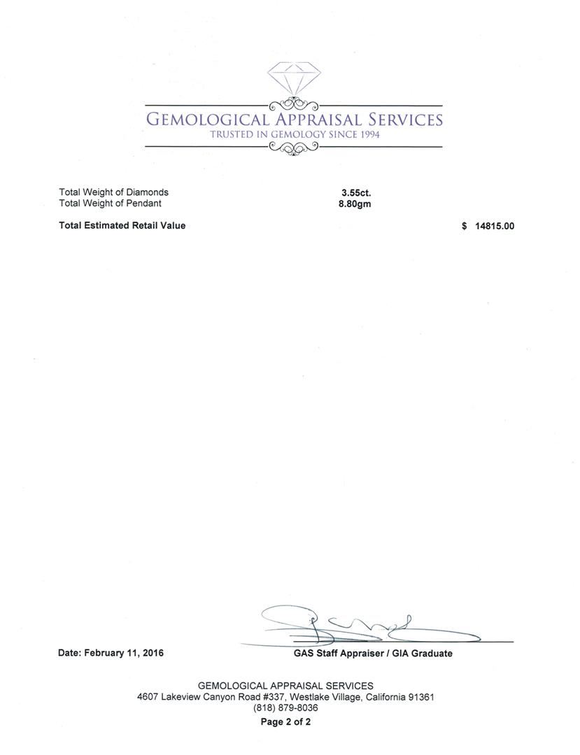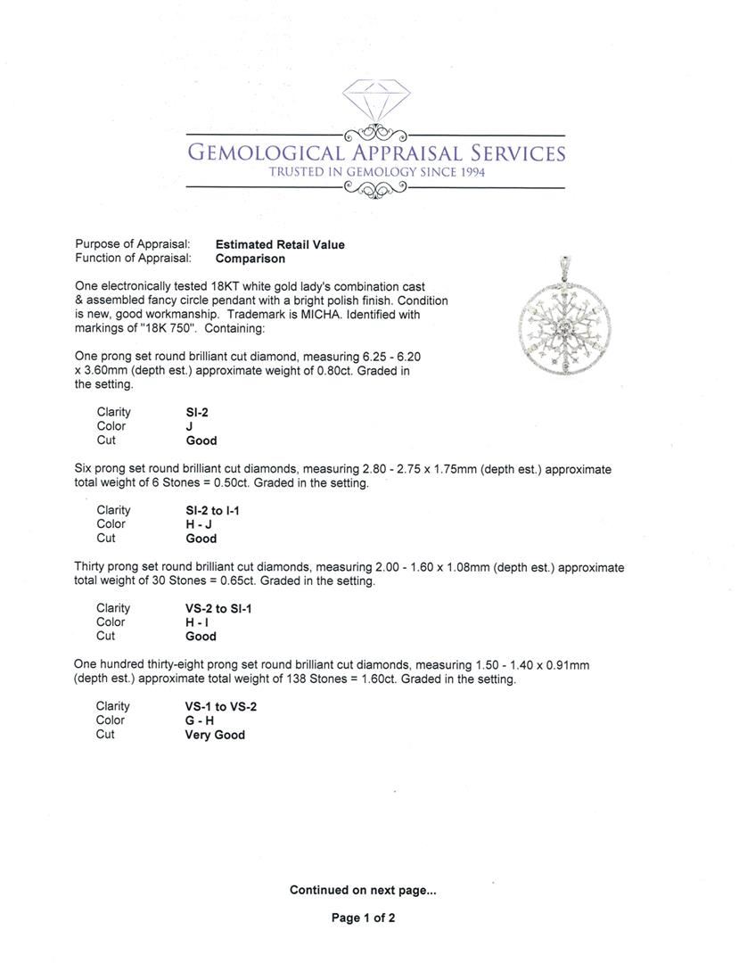 One electronically tested 18KT white gold lady's combination cast & assembled fancy circle pendant with a bright polish finish. Trademark is MICHA. Identified with markings of "18K 750". Condition is new, good workmanship. Containing: One prong set round brilliant cut diamond, measuring 6.25 - 6.20 x 3.60mm (depth est.) approximate weight of 0.80ct. Graded in the setting. Clarity: SI-2. Color: Good Six prong set round brilliant cut diamonds, measuring 2.80 - 2.75 x 1.75mm (depth est.) approximate total weight of 6 Stones = 0.50ct. Graded in the setting. Clarity: SI-2 to I-1. Color: H - Good Thirty prong set round brilliant cut diamonds, measuring 2.00 - 1.60 x 1.08mm (depth est.) approximate total weight of 30 Stones = 0.65ct. Graded in the setting. Clarity: VS-2 to SI-1. Color: H - I. Cut Good One Hundred Thirty-Eight prong set round brilliant cut diamonds, measuring 1.50 - 1.40 x 0.91mm (depth est.) approximate total weight of 138 Stones = 1.60ct. Graded in the setting. Clarity: VS-1 to VS-2. Color: G - Very Good. Total Weight of Diamonds 3.55ct. Total Weight of Pendant 8.80gm. GAS Appraised at $14,815.00.