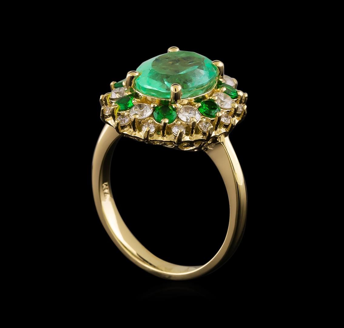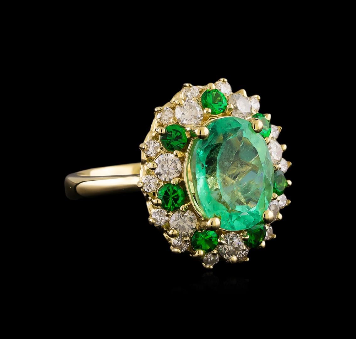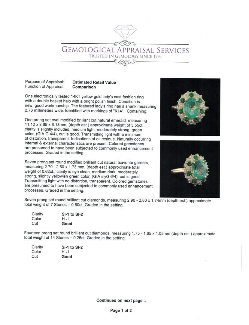 One electronically tested 14KT yellow gold lady's cast fashion ring with a double basket halo with a bright polish finish. The featured lady's ring has a shank measuring 2.76 millimeters wide. Identified with markings of "K14". Condition is new, good workmanship. Containing: One prong set oval modified brilliant cut natural emerald, measuring 11.12 x 8.65 x 6.18mm, (depth est.) approximate weight of 3.55ct., clarity is slightly included, medium light, moderately strong, green color, (GIA G 4/4), cut is good. Transmitting light with a minimum of distortion, transparent. Indications of oil residue. Naturally occurring internal & external characteristics are present. Colored gemstones are presumed to have been subjected to commonly used enhancement processes. Graded in the setting. Seven prong set round modified brilliant cut natural tsavorite garnets, measuring 2.70 - 2.60 x 1.73 mm, (depth est.) approximate total weight of 0.62ct., clarity is eye clean, medium dark, moderately strong, slightly yellowish green color, (GIA slyG 6/4), cut is good. Transmitting light with no distortion, transparent. Colored gemstones are presumed to have been subjected to commonly used enhancement processes. Graded in the setting. Seven prong set round brilliant cut diamonds, measuring 2.90 - 2.80 x 1.74mm (depth est.) approximate total weight of 7 Stones = 0.60ct. Graded in the setting. Clarity: SI-1 to SI-2. Color: H - I. Cut Good Fourteen prong set round brilliant cut diamonds, measuring 1.75 - 1.65 x 1.05mm (depth est.) approximate total weight of 14 Stones = 0.26ct. Graded in the setting. Clarity: SI-1 to SI-2. Color: H - I. Cut Good. Total Weight of Colored Stones 4.17ct. Total Weight of Diamonds 0.86ct. Total Weight of Ring 6.50gm. GAS Appraised at $8,040.00.